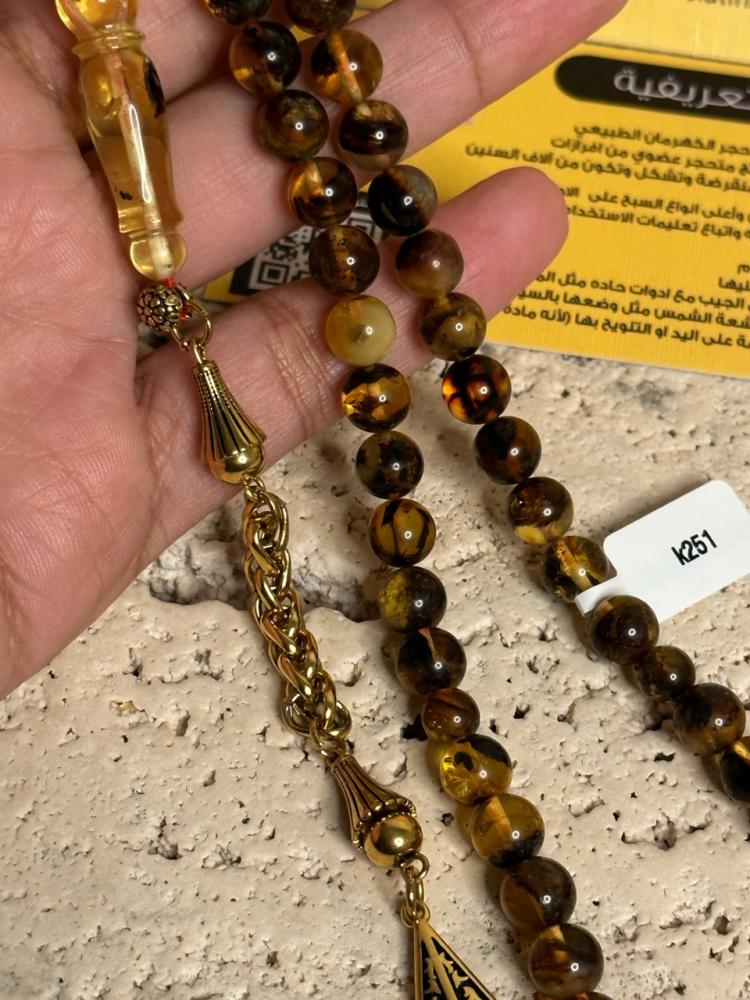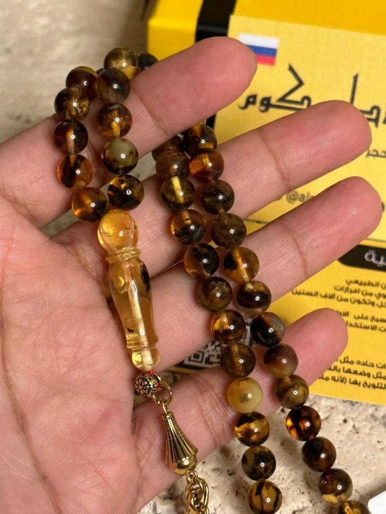 الكهرمان حجر عضوي ومن ميزته انه يكون خفيف الوزن واخف من اي سبحة ممكن تشوفه وصوت الخرز رنان يشبه صوت القزاز