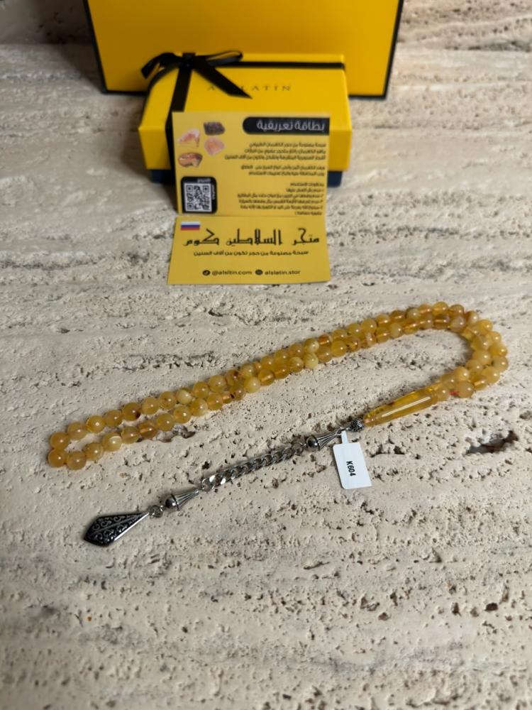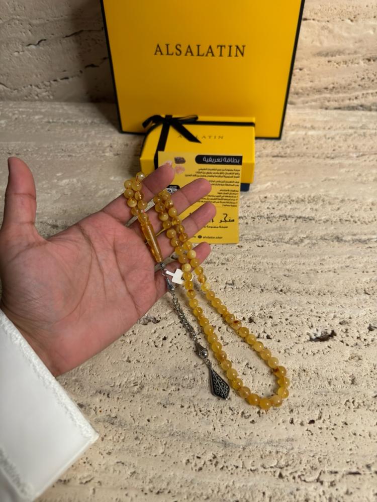 الكهرمان حجر عضوي ومن ميزته انه يكون خفيف الوزن واخف من اي سبحة ممكن تشوفه وصوت الخرز رنان يشبه صوت القزاز