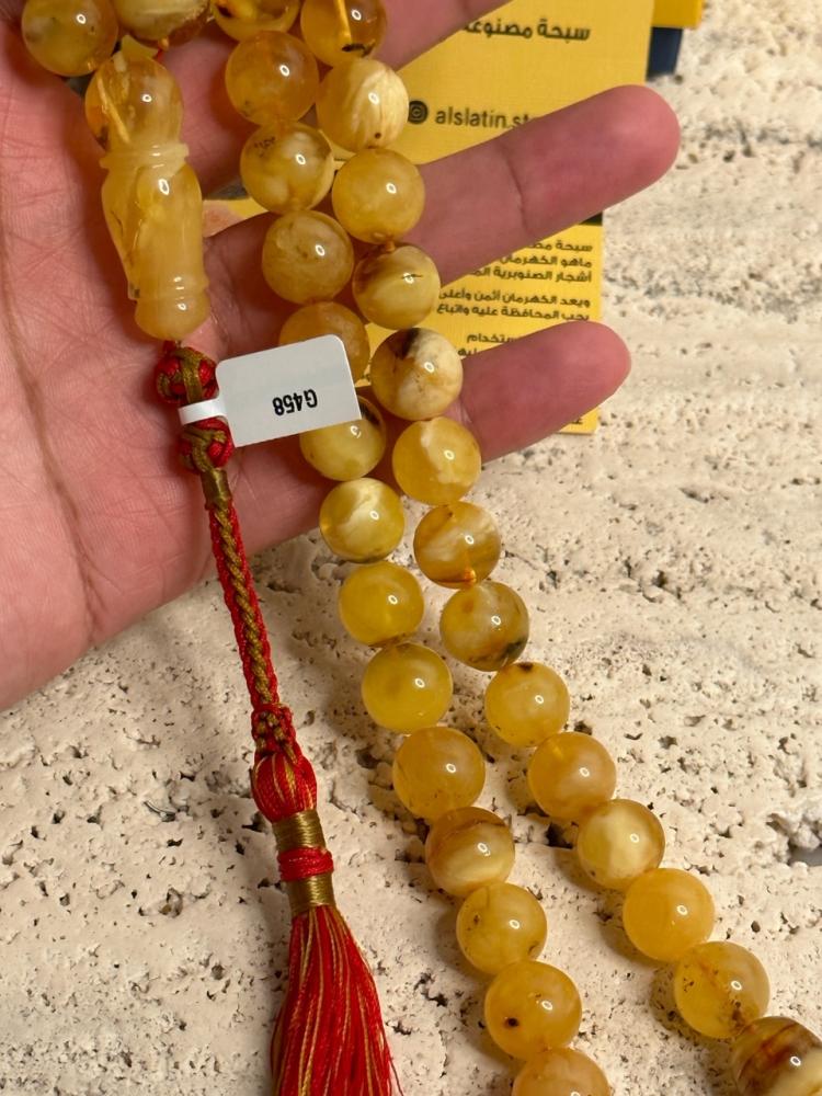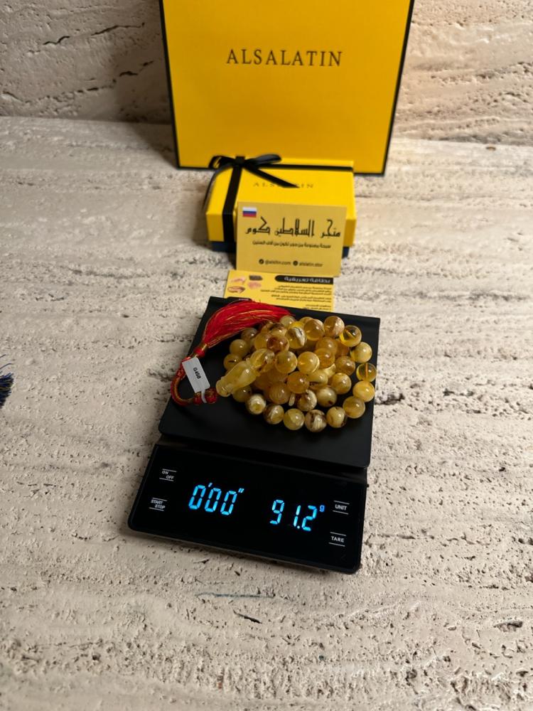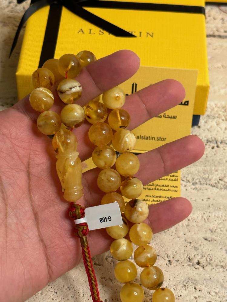 الكهرمان حجر عضوي ومن ميزته انه يكون خفيف الوزن واخف من اي سبحة ممكن تشوفه وصوت الخرز رنان يشبه صوت القزاز