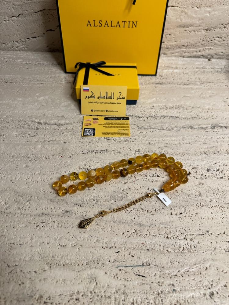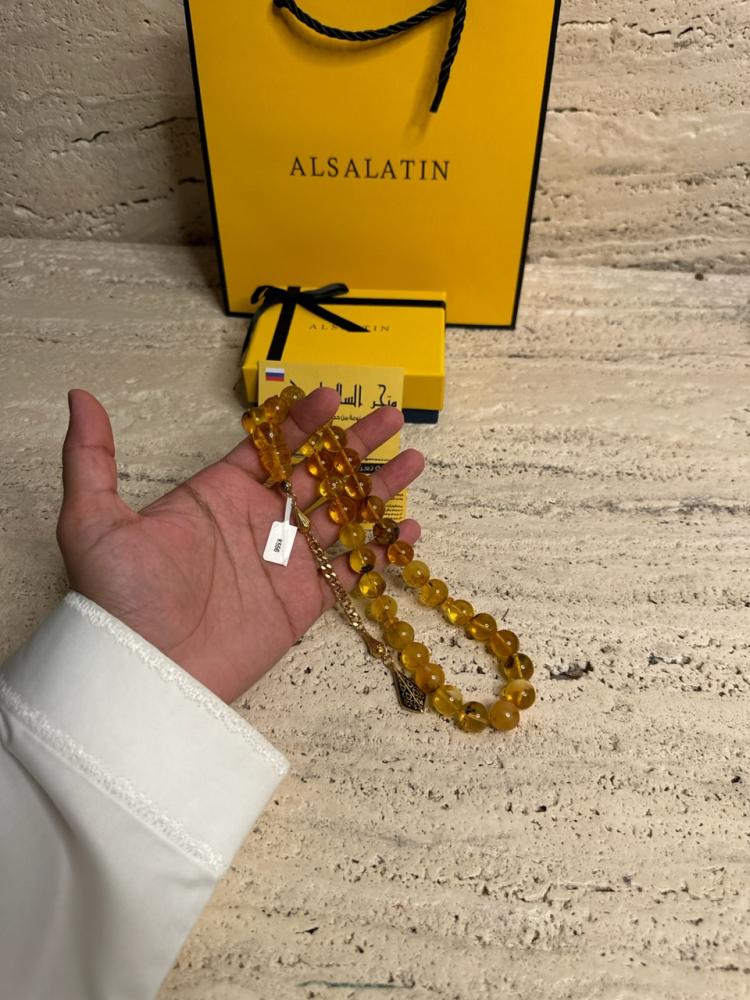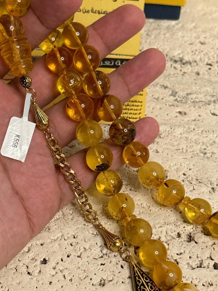 الكهرمان حجر عضوي ومن ميزته انه يكون خفيف الوزن واخف من اي سبحة ممكن تشوفه وصوت الخرز رنان يشبه صوت القزاز