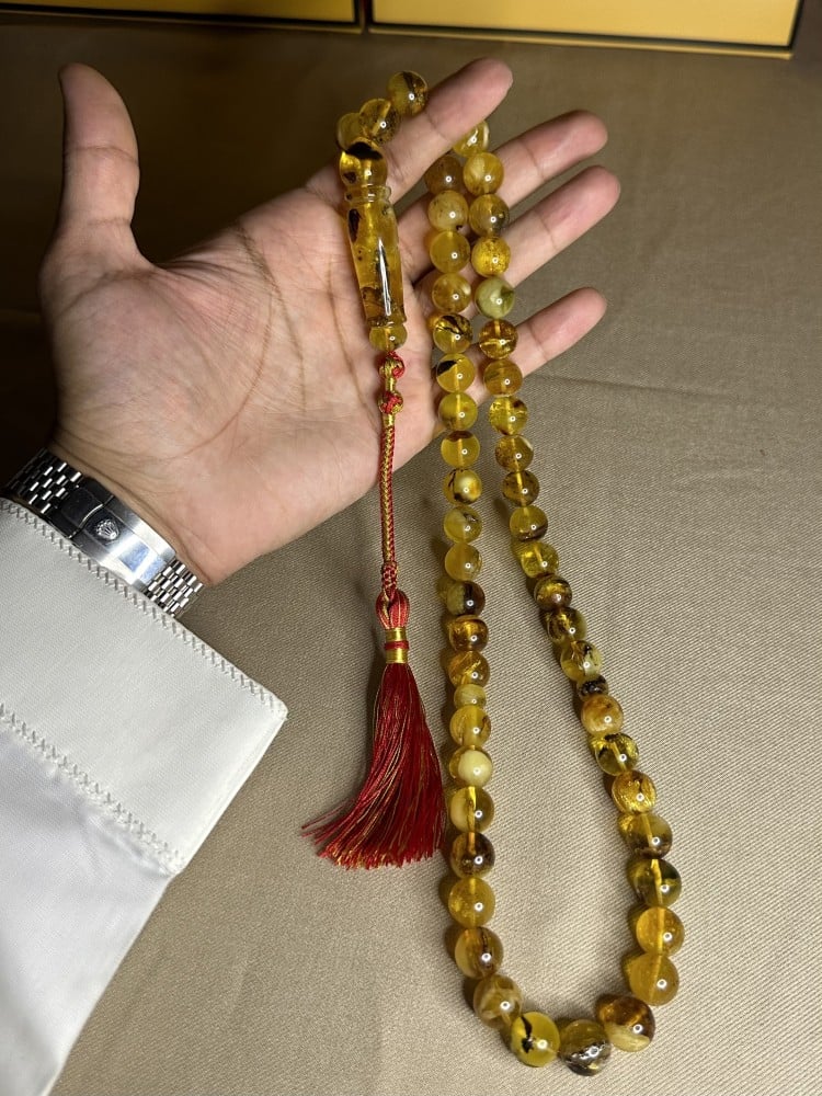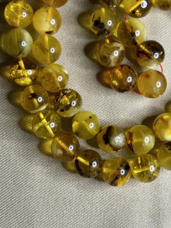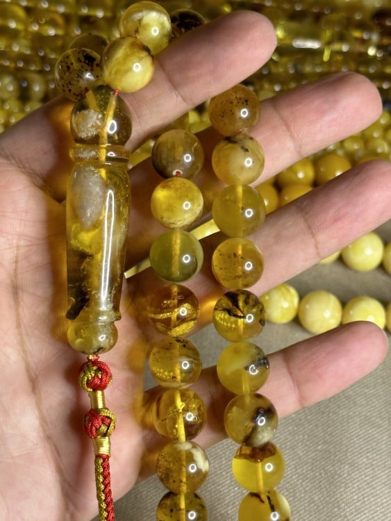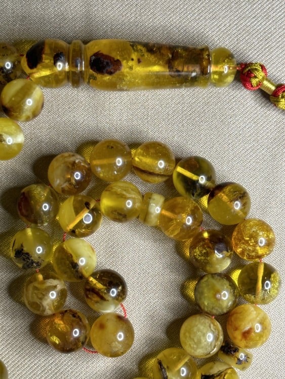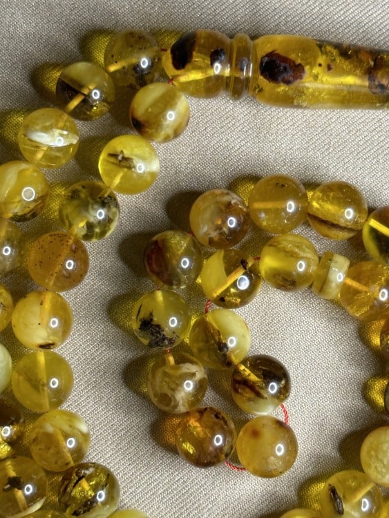 بعض الخرز او الشاهد قد يكون فيه شوائب ملموسه وهذا طبيعة الكهرمان الشوائب الطبيعية
