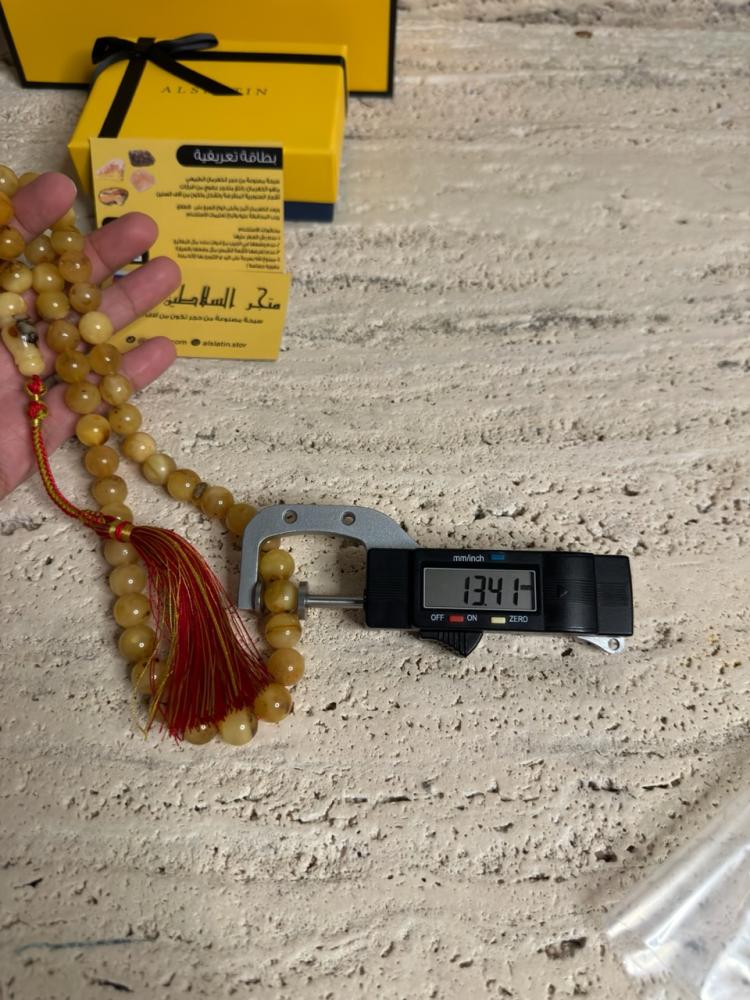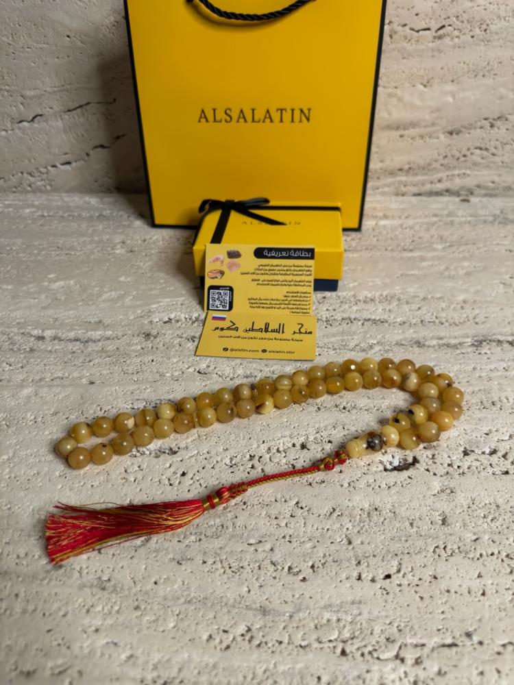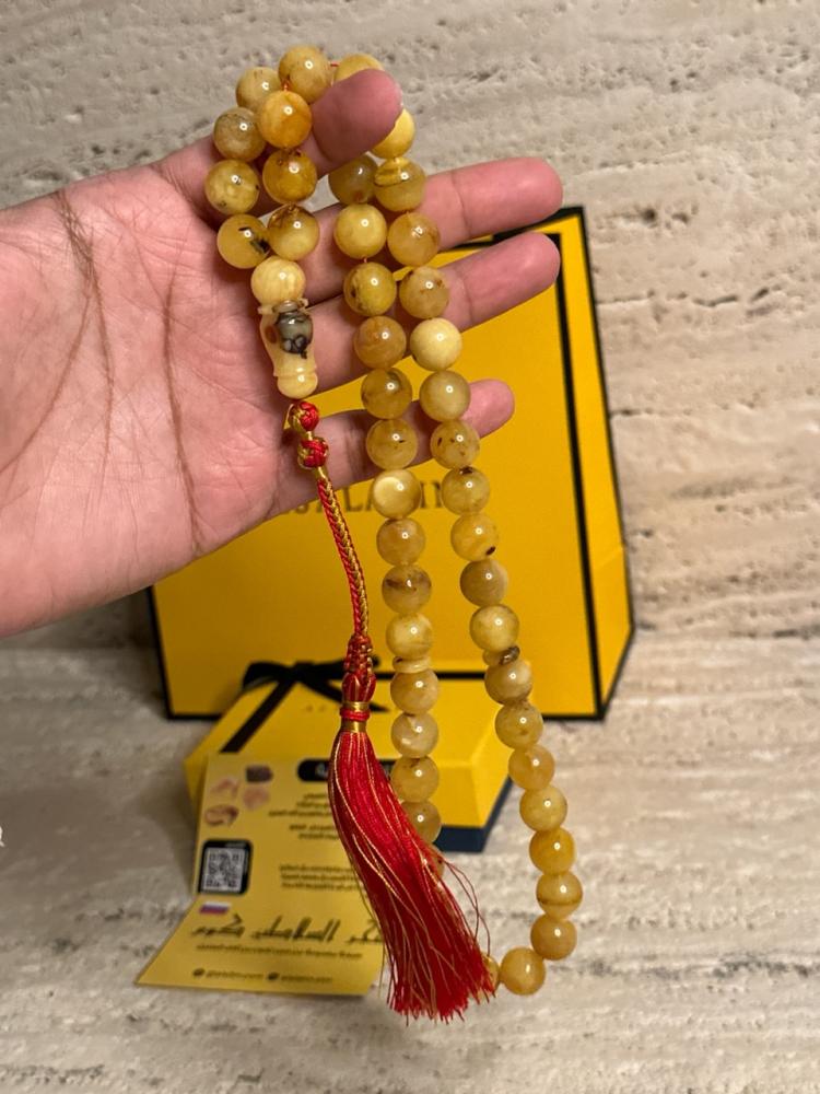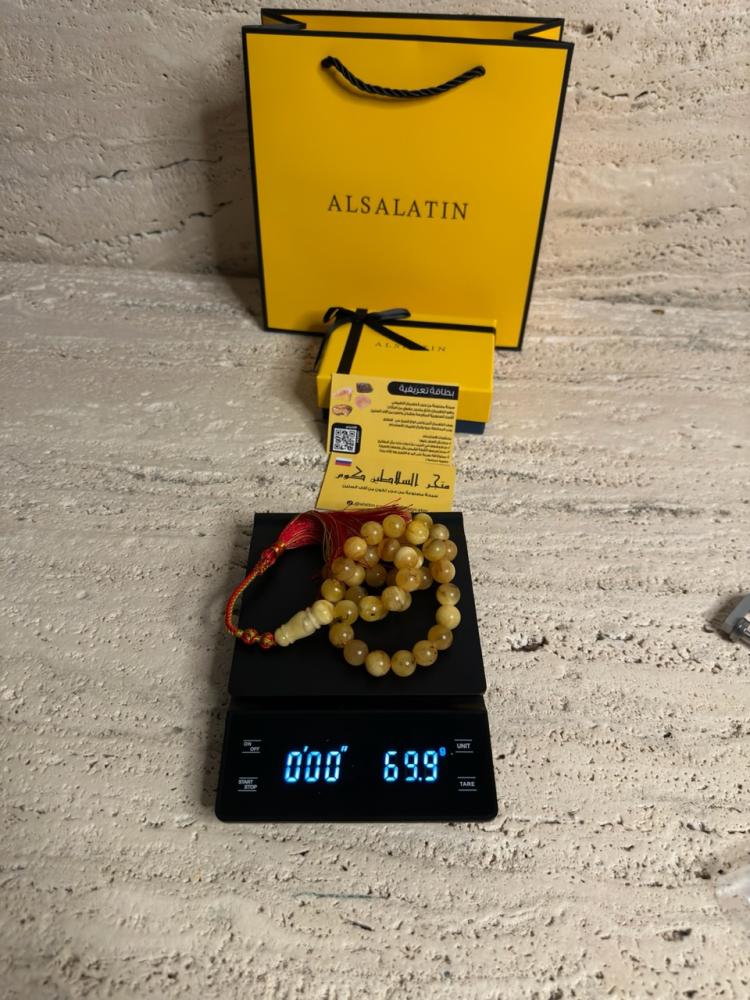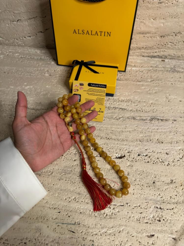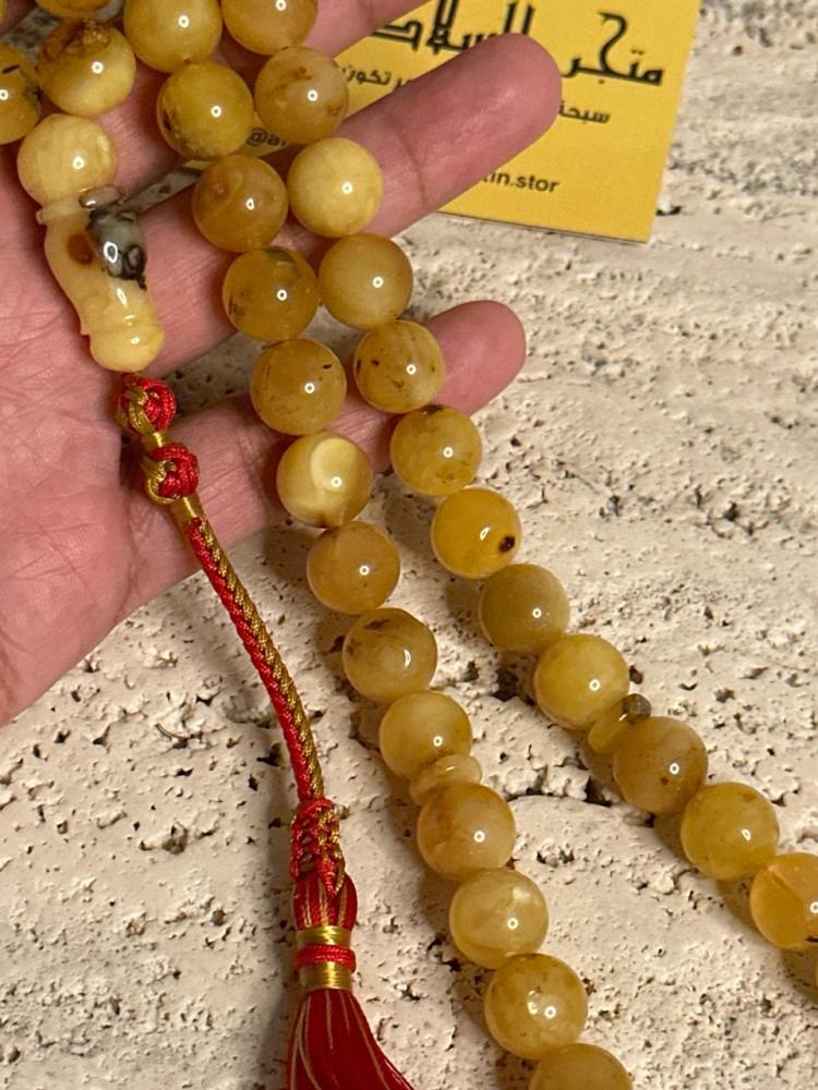 الكهرمان حجر عضوي ومن ميزته انه يكون خفيف الوزن واخف من اي سبحة ممكن تشوفه وصوت الخرز رنان يشبه صوت القزاز