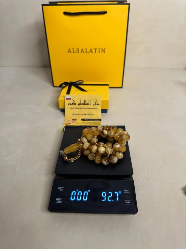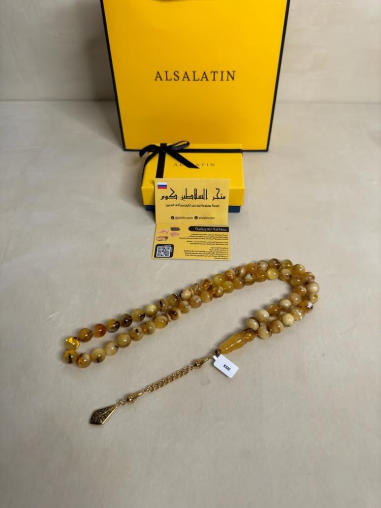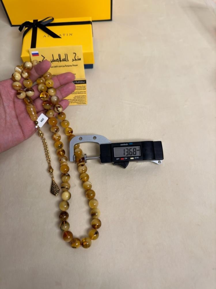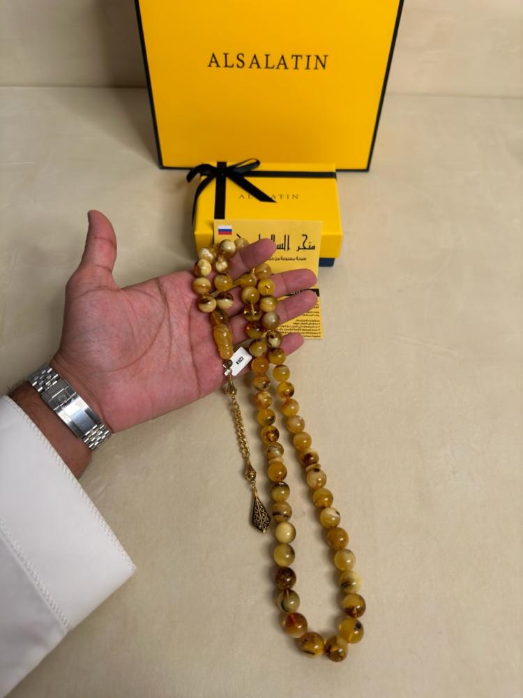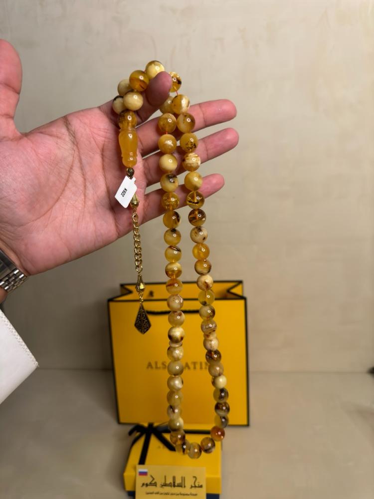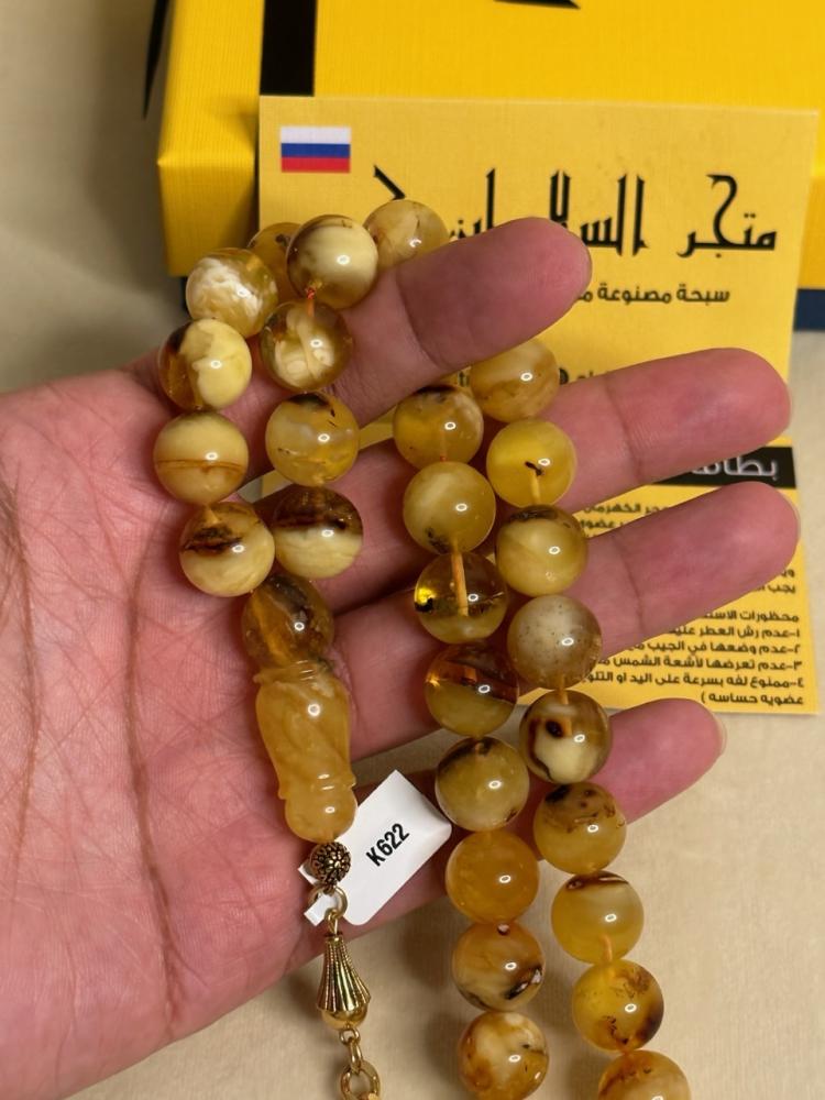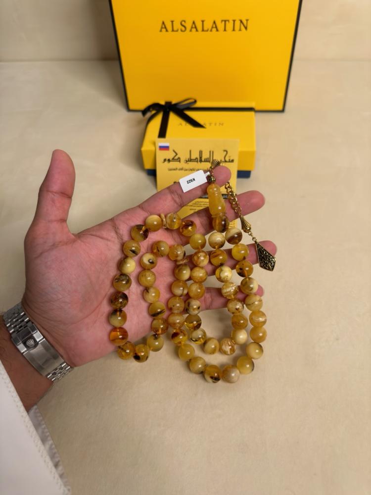 الكهرمان حجر عضوي ومن ميزته انه يكون خفيف الوزن واخف من اي سبحة ممكن تشوفه وصوت الخرز رنان يشبه صوت القزاز