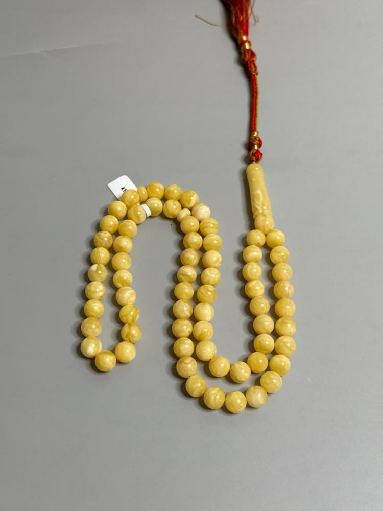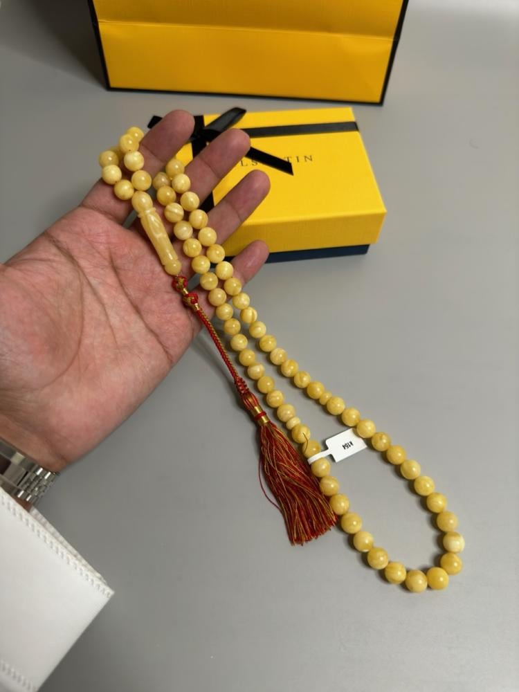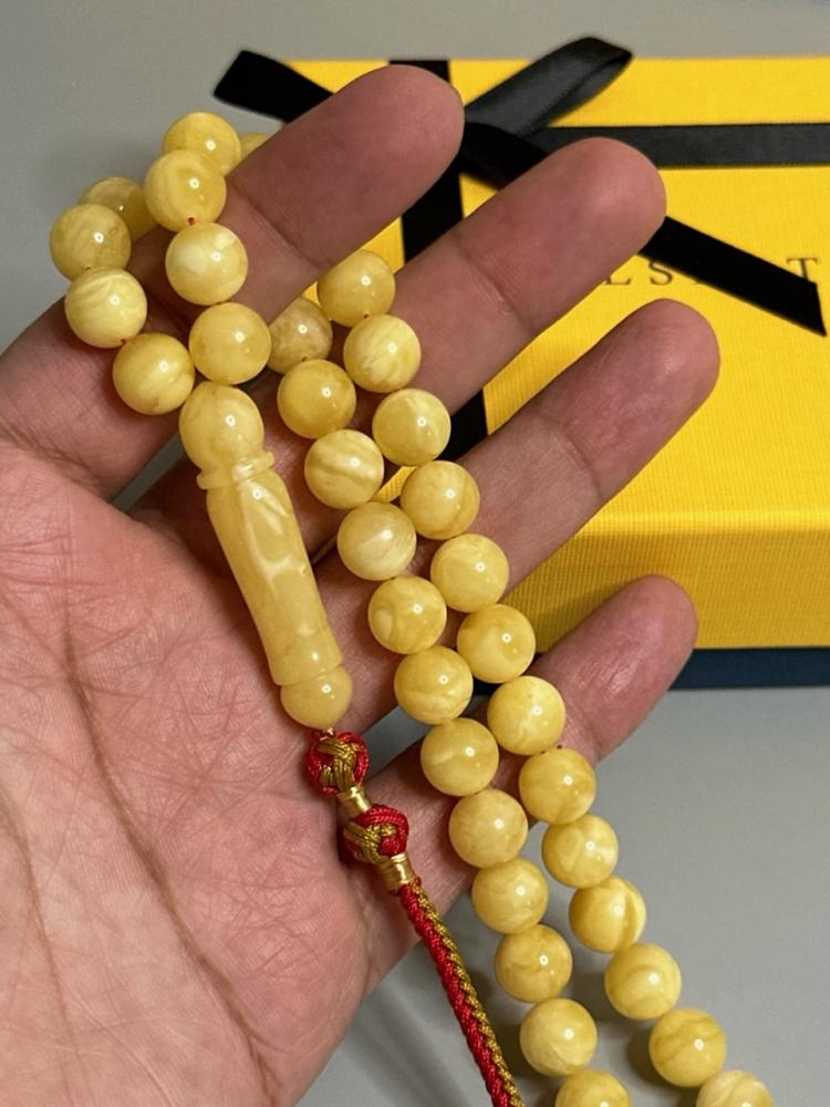 الكهرمان حجر عضوي ومن ميزته انه يكون خفيف الوزن واخف من اي سبحة ممكن تشوفه وصوت الخرز رنان يشبه صوت القزاز