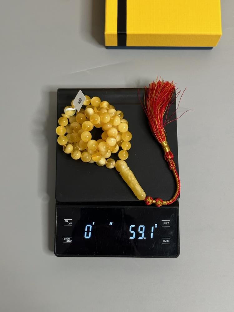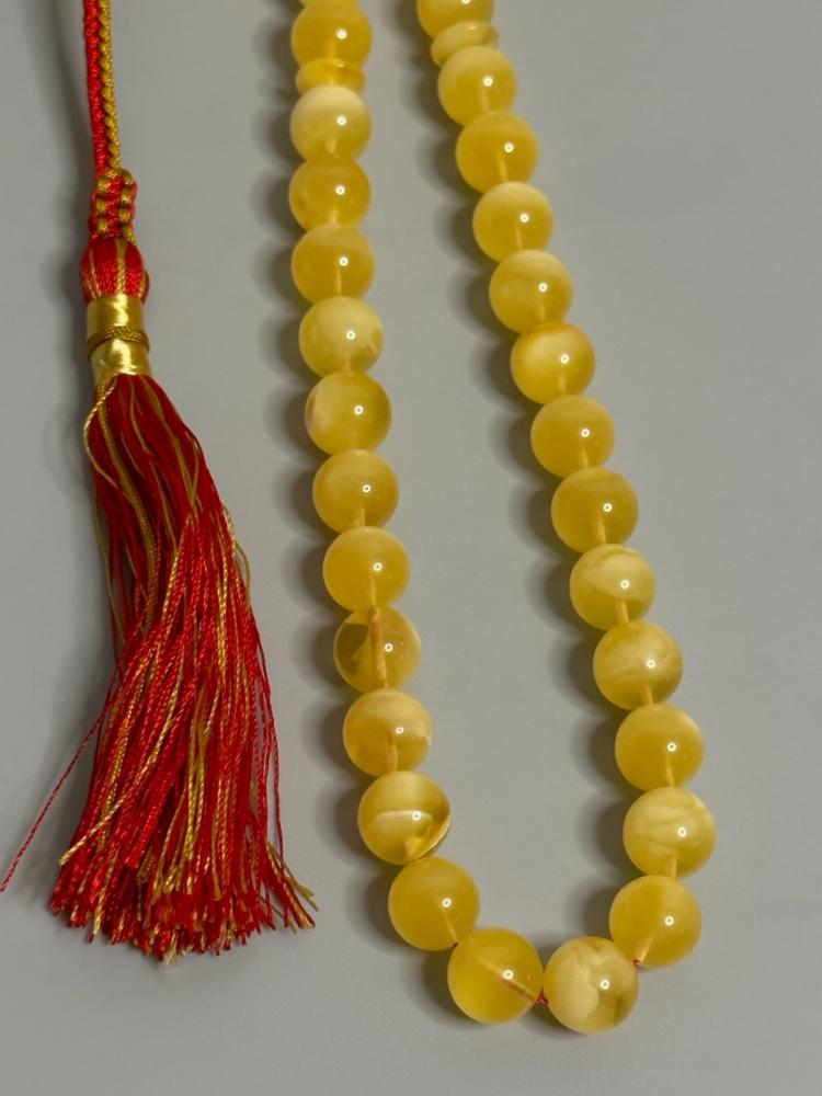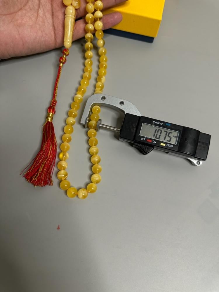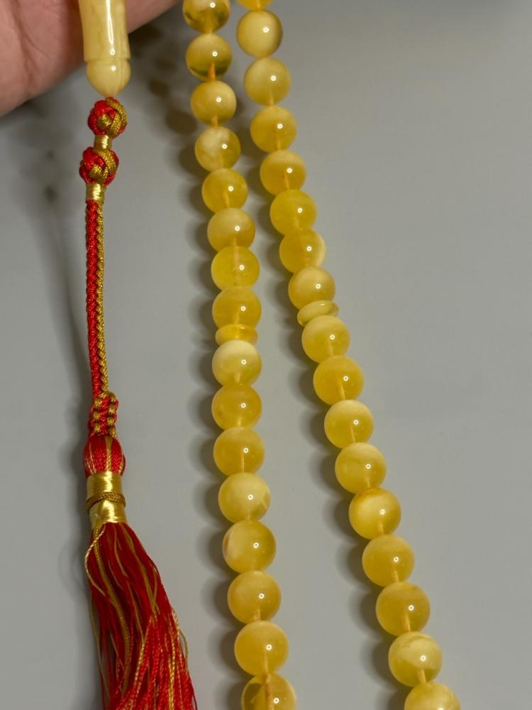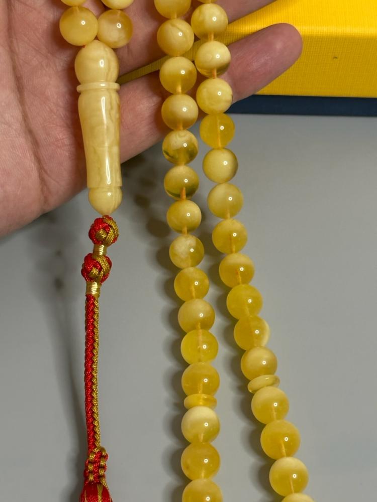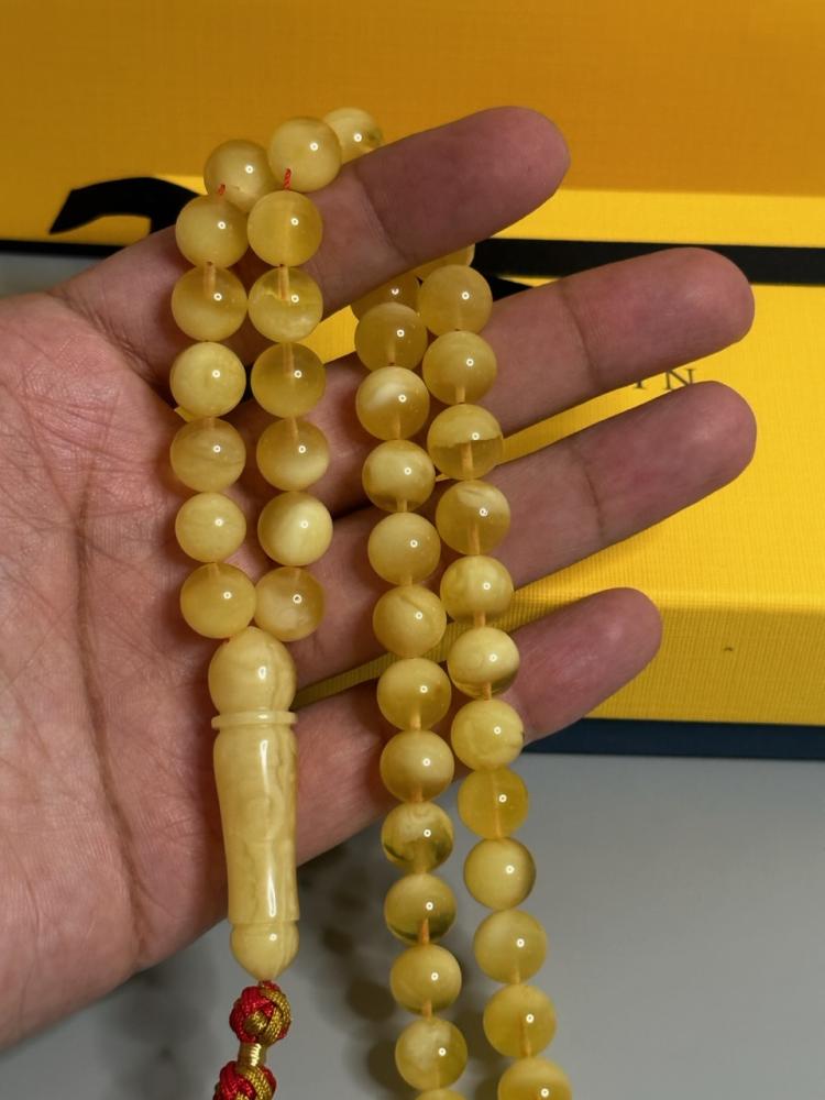 الكهرمان حجر عضوي ومن ميزته انه يكون خفيف الوزن واخف من اي سبحة ممكن تشوفه وصوت الخرز رنان يشبه صوت القزاز