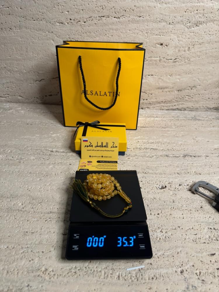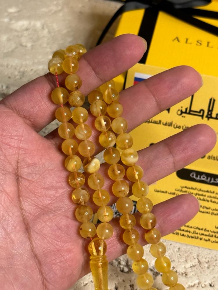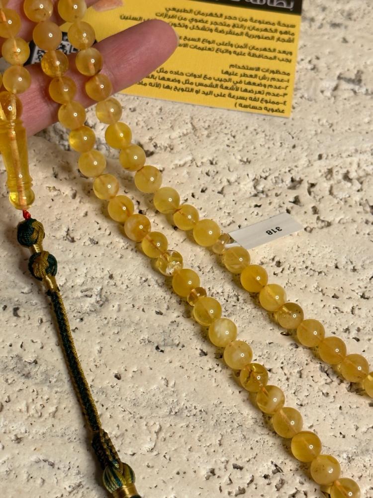 الكهرمان حجر عضوي ومن ميزته انه يكون خفيف الوزن واخف من اي سبحة ممكن تشوفه وصوت الخرز رنان يشبه صوت القزاز