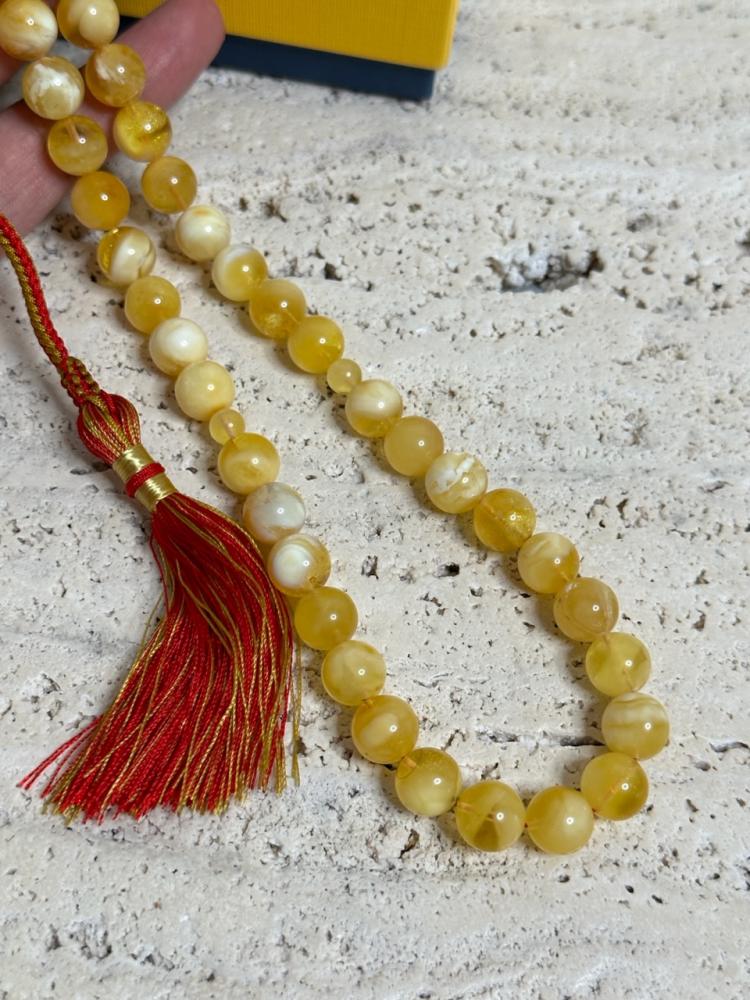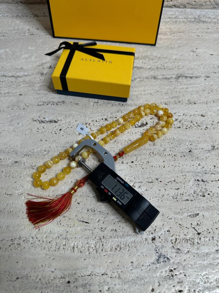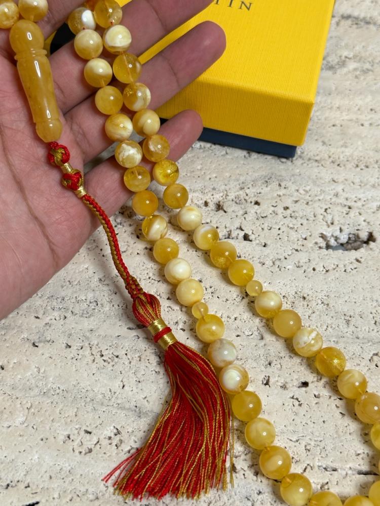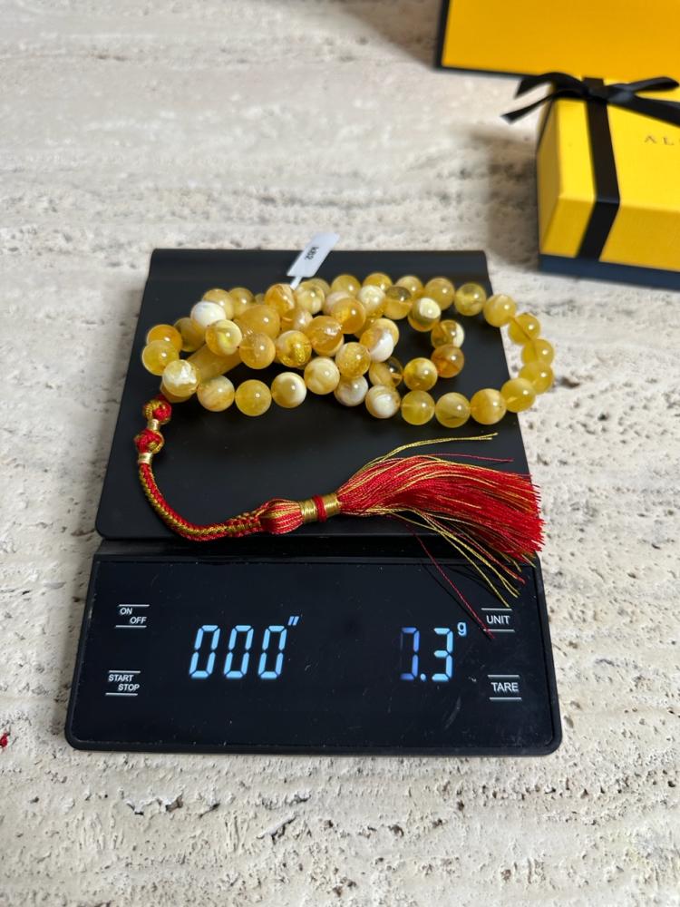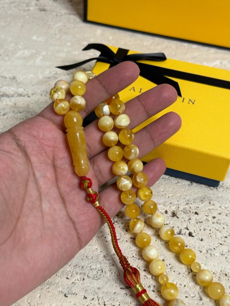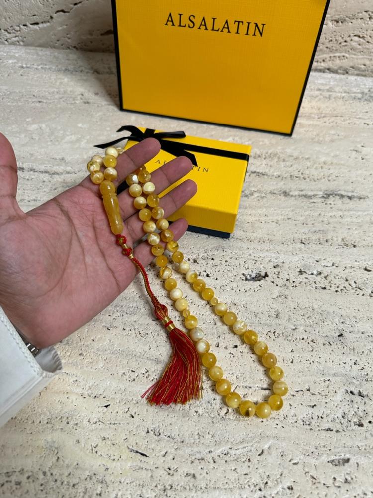 الكهرمان حجر عضوي ومن ميزته انه يكون خفيف الوزن واخف من اي سبحة ممكن تشوفه وصوت الخرز رنان يشبه صوت القزاز