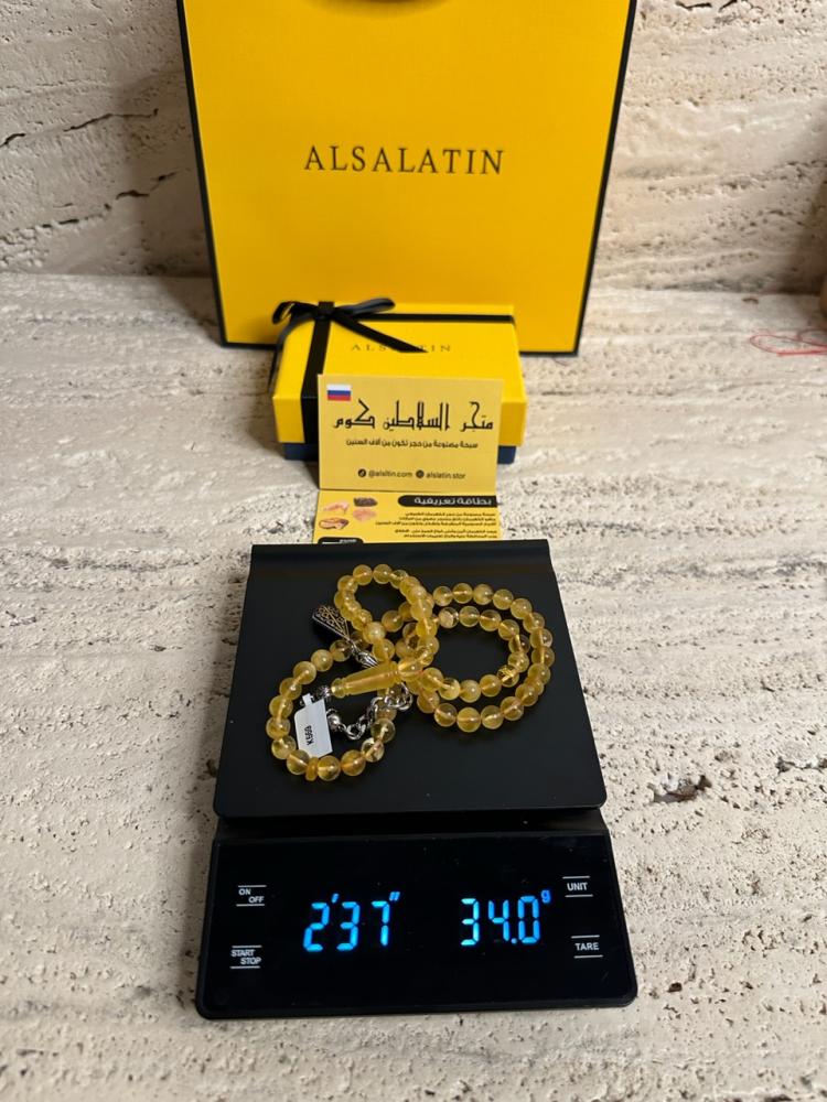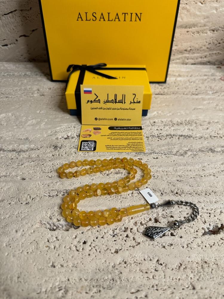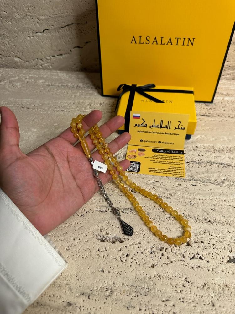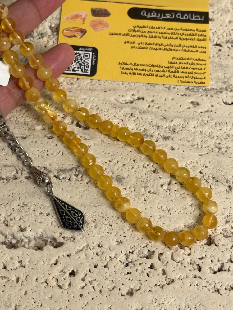 الكهرمان حجر عضوي ومن ميزته انه يكون خفيف الوزن واخف من اي سبحة ممكن تشوفه وصوت الخرز رنان يشبه صوت القزاز