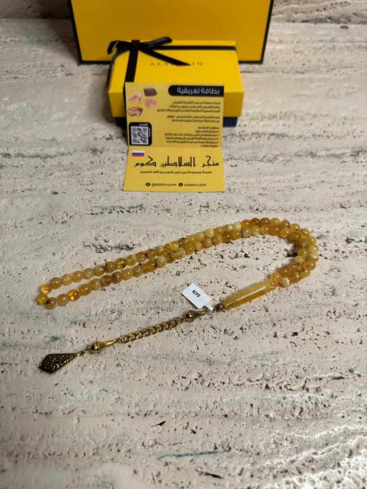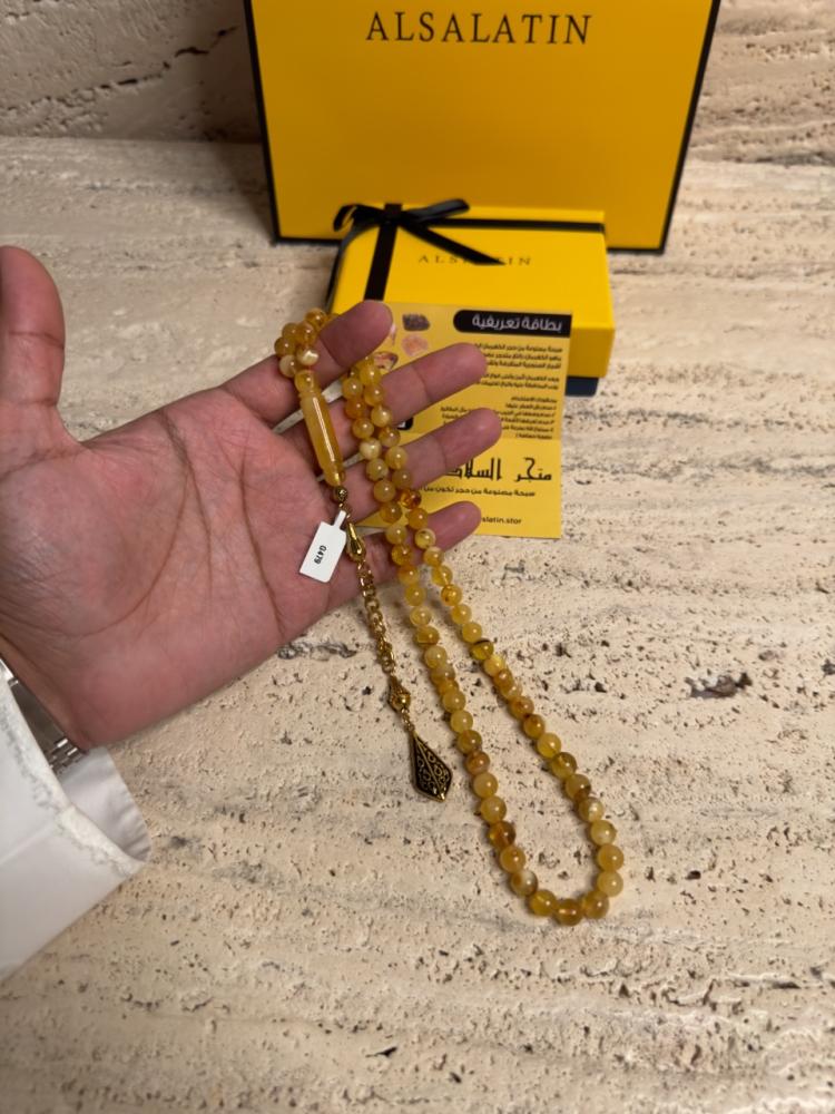 الكهرمان حجر عضوي ومن ميزته انه يكون خفيف الوزن واخف من اي سبحة ممكن تشوفه وصوت الخرز رنان يشبه صوت القزاز
