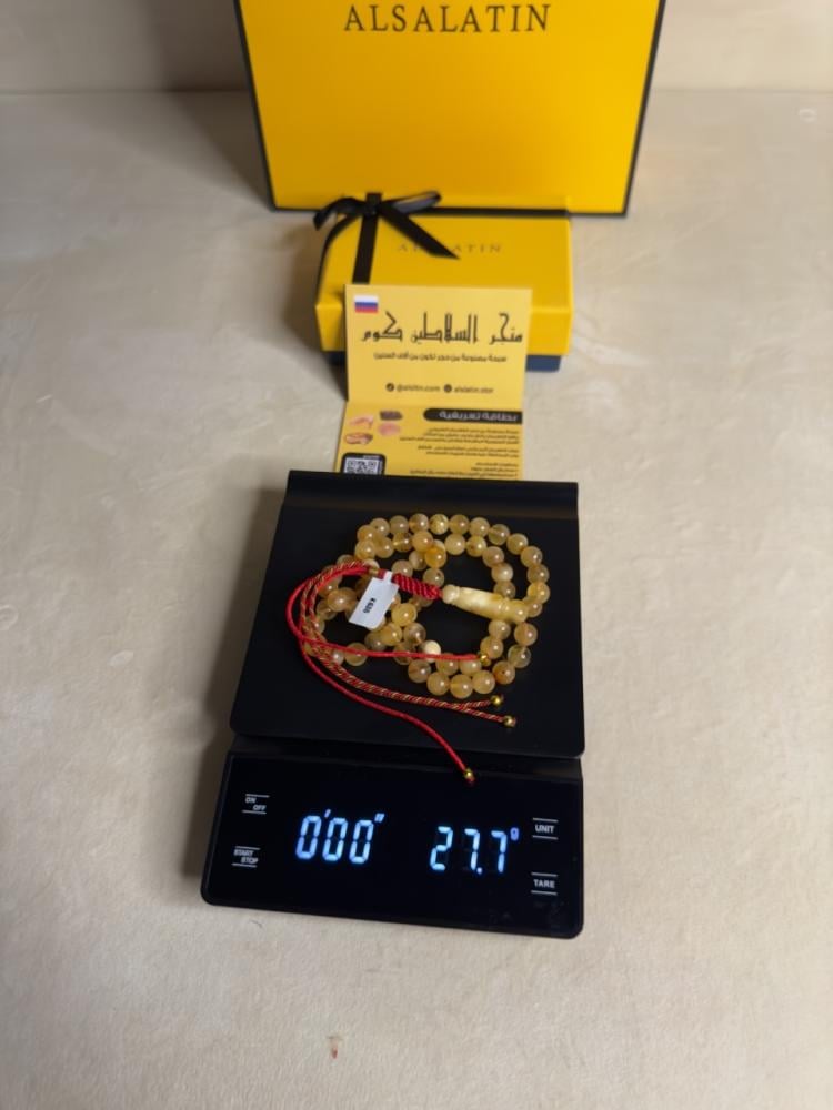 الكهرمان حجر عضوي ومن ميزته انه يكون خفيف الوزن واخف من اي سبحة ممكن تشوفه وصوت الخرز رنان يشبه صوت القزاز