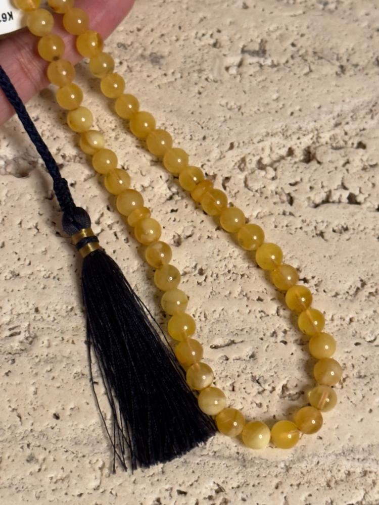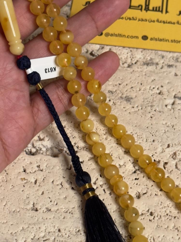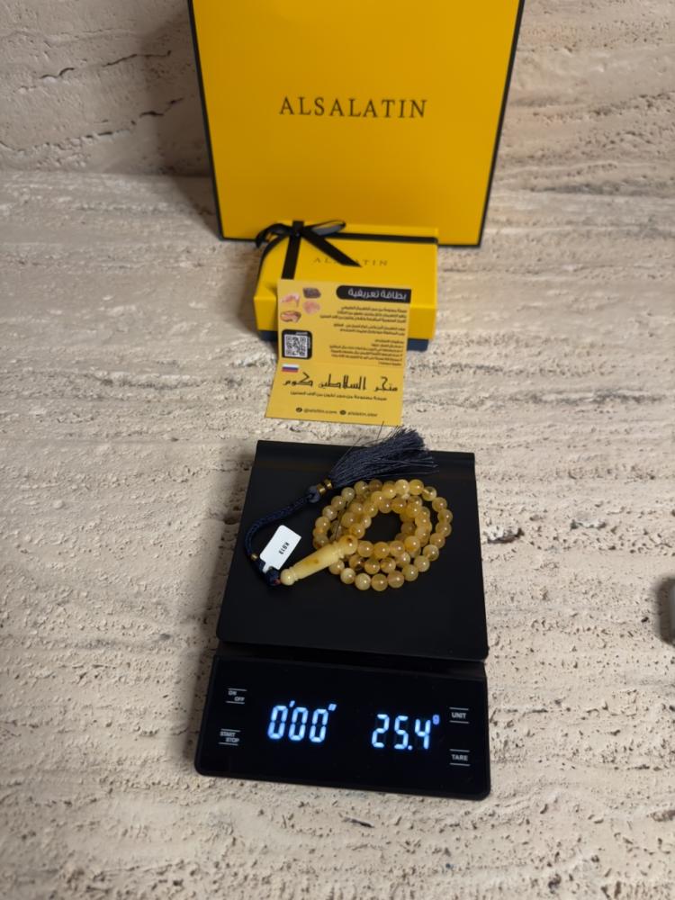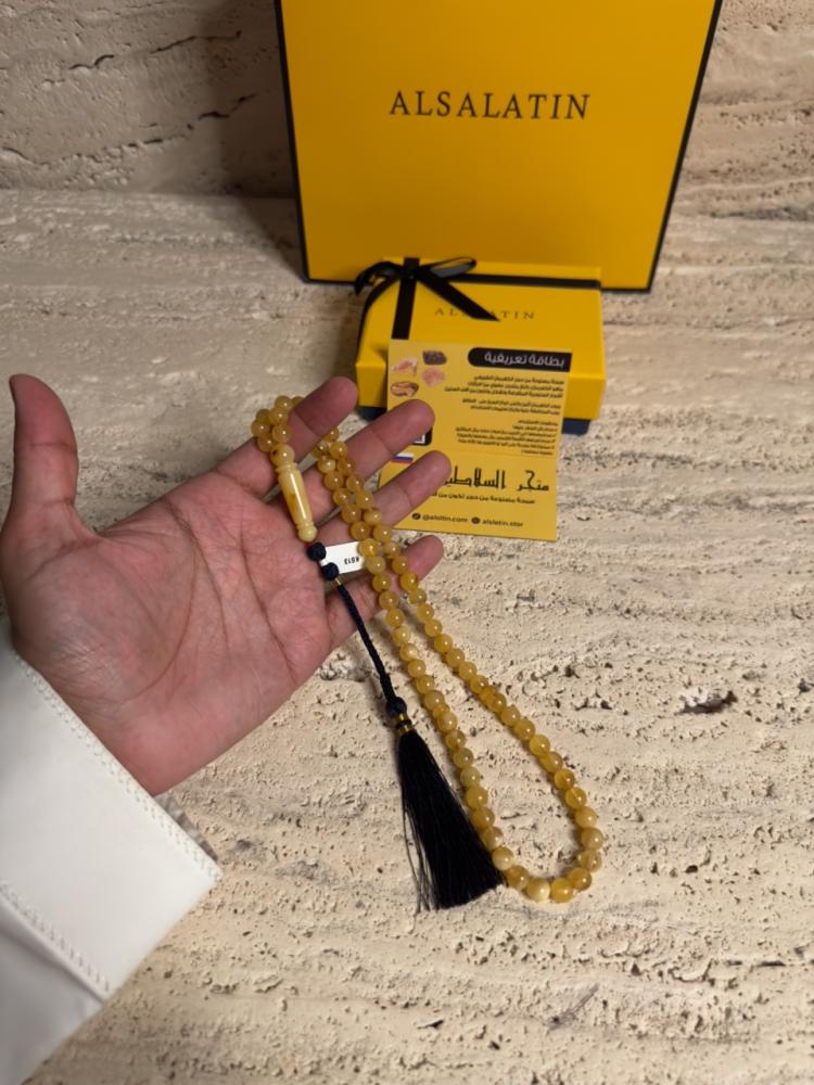 الكهرمان حجر عضوي ومن ميزته انه يكون خفيف الوزن واخف من اي سبحة ممكن تشوفه وصوت الخرز رنان يشبه صوت القزاز