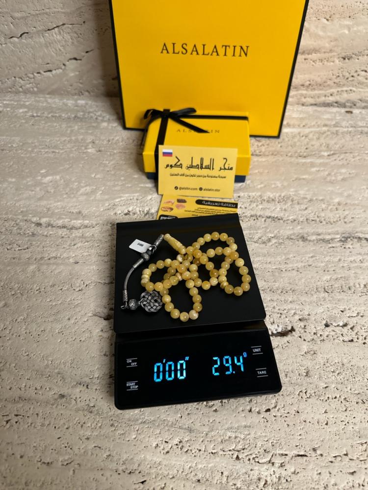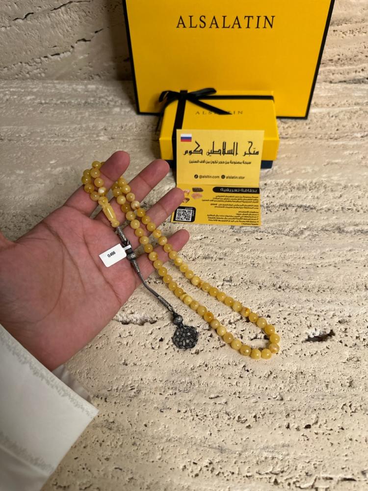 الكهرمان حجر عضوي ومن ميزته انه يكون خفيف الوزن واخف من اي سبحة ممكن تشوفه وصوت الخرز رنان يشبه صوت القزاز
