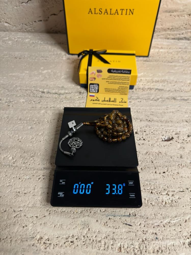 الكهرمان حجر عضوي ومن ميزته انه يكون خفيف الوزن واخف من اي سبحة ممكن تشوفه وصوت الخرز رنان يشبه صوت القزاز