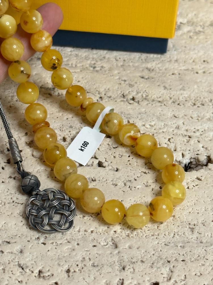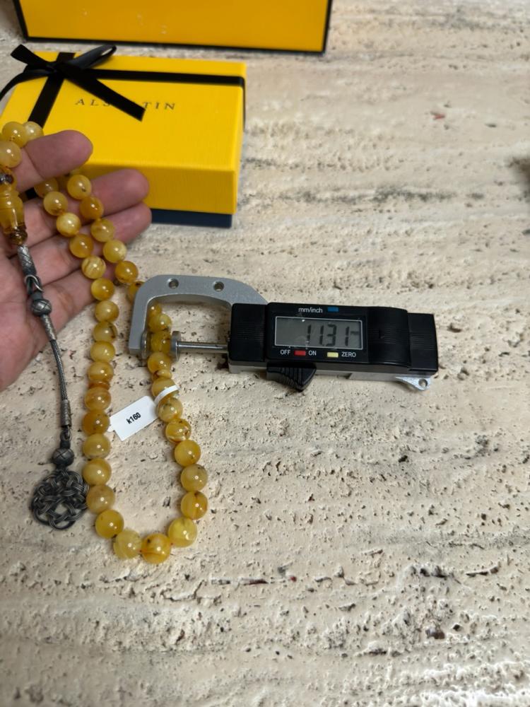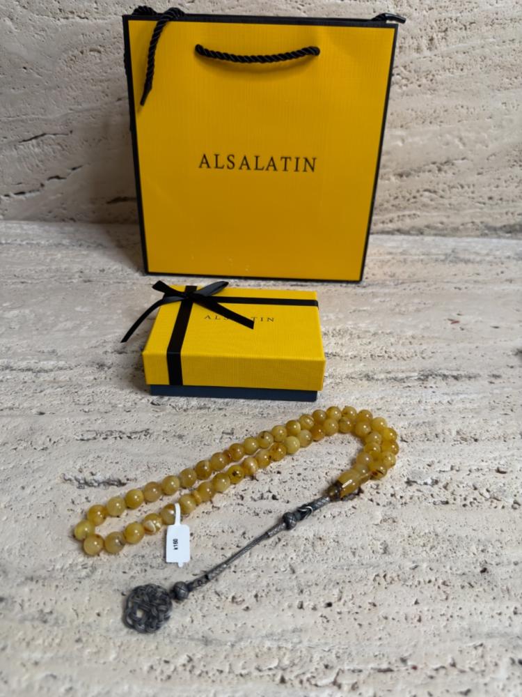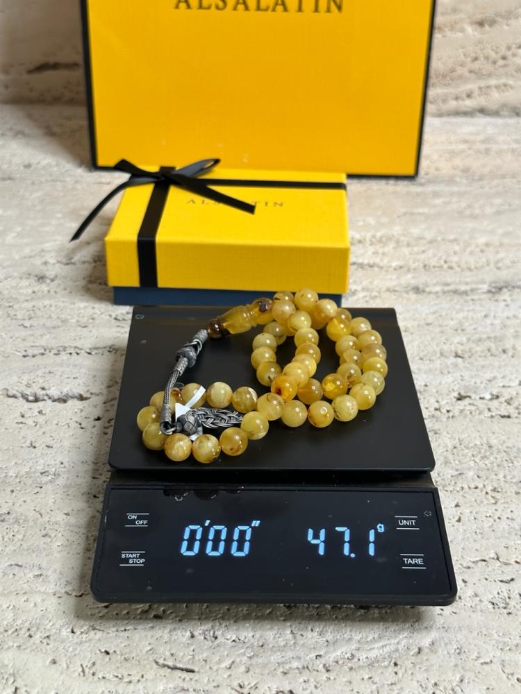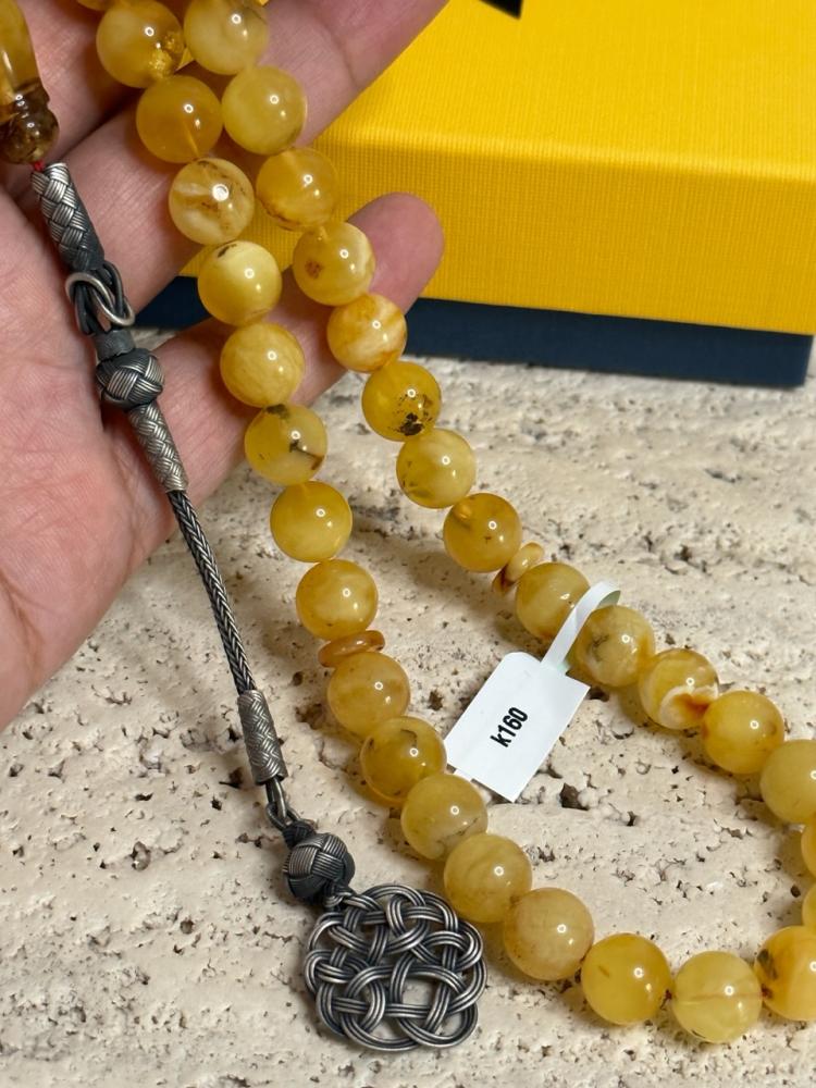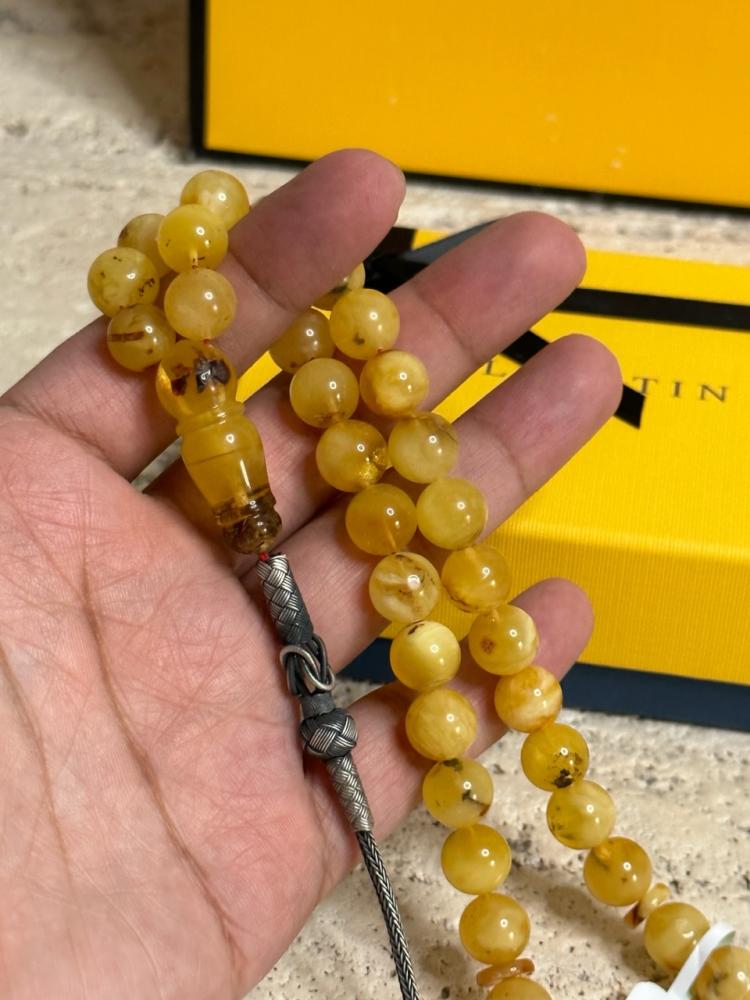 الكهرمان حجر عضوي ومن ميزته انه يكون خفيف الوزن واخف من اي سبحة ممكن تشوفه وصوت الخرز رنان يشبه صوت القزاز