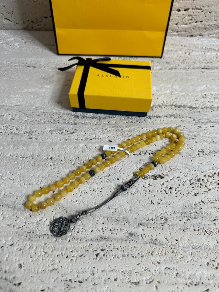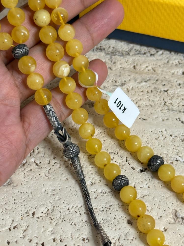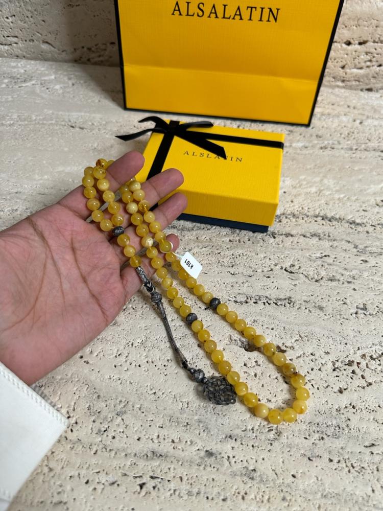 الكهرمان حجر عضوي ومن ميزته انه يكون خفيف الوزن واخف من اي سبحة ممكن تشوفه وصوت الخرز رنان يشبه صوت القزاز
