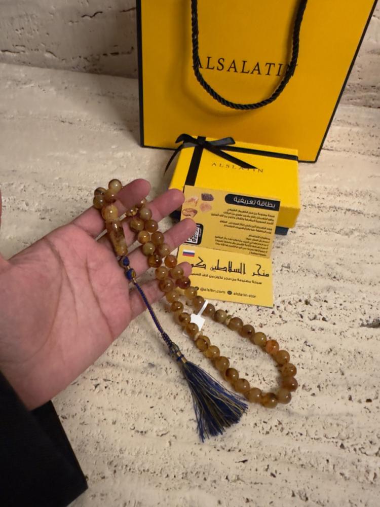 الكهرمان حجر عضوي ومن ميزته انه يكون خفيف الوزن واخف من اي سبحة ممكن تشوفه وصوت الخرز رنان يشبه صوت القزاز