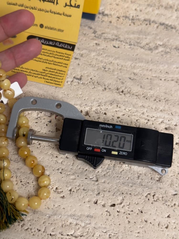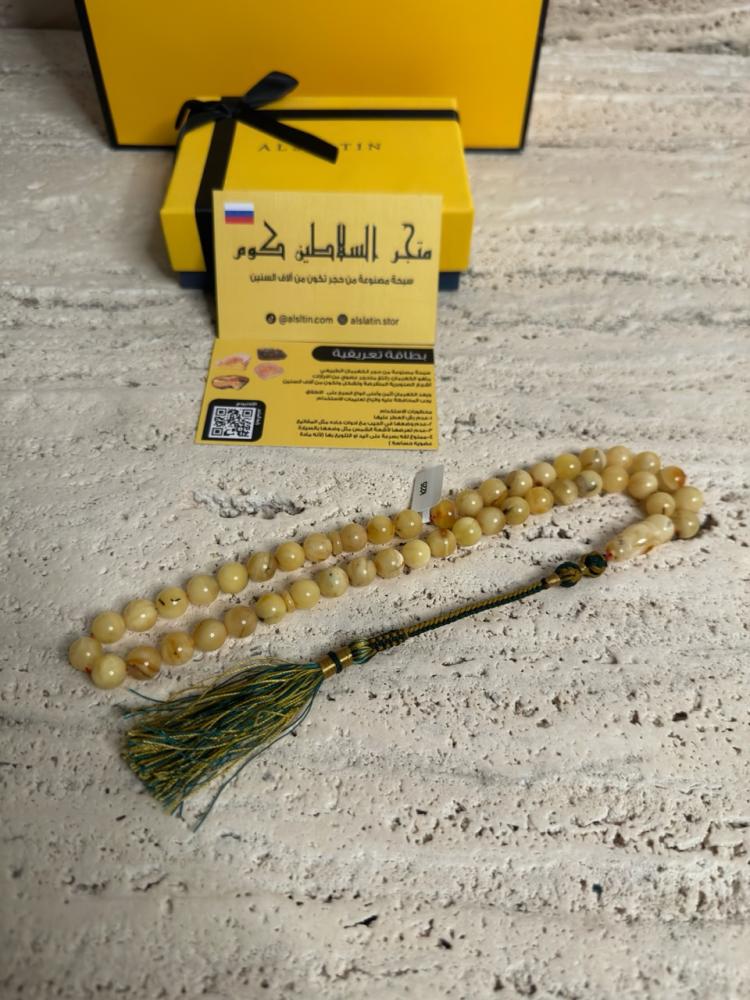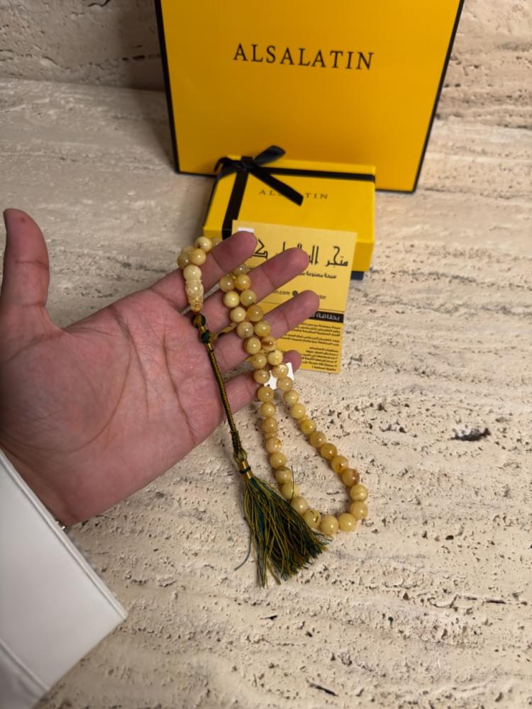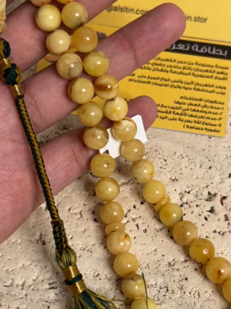 الكهرمان حجر عضوي ومن ميزته انه يكون خفيف الوزن واخف من اي سبحة ممكن تشوفه وصوت الخرز رنان يشبه صوت القزاز