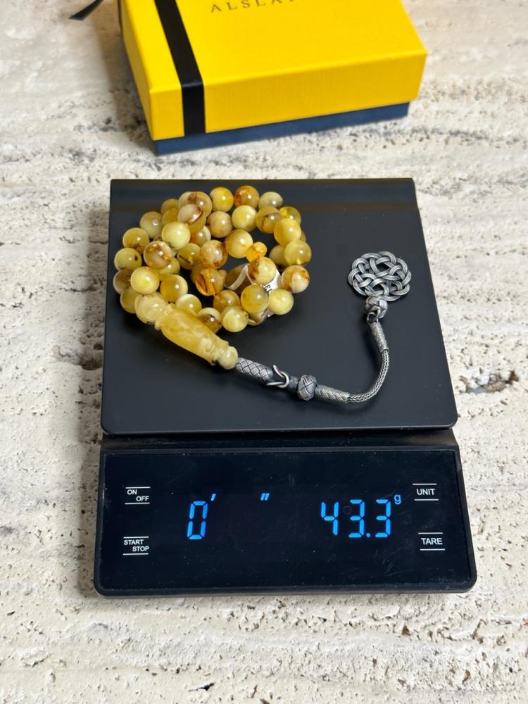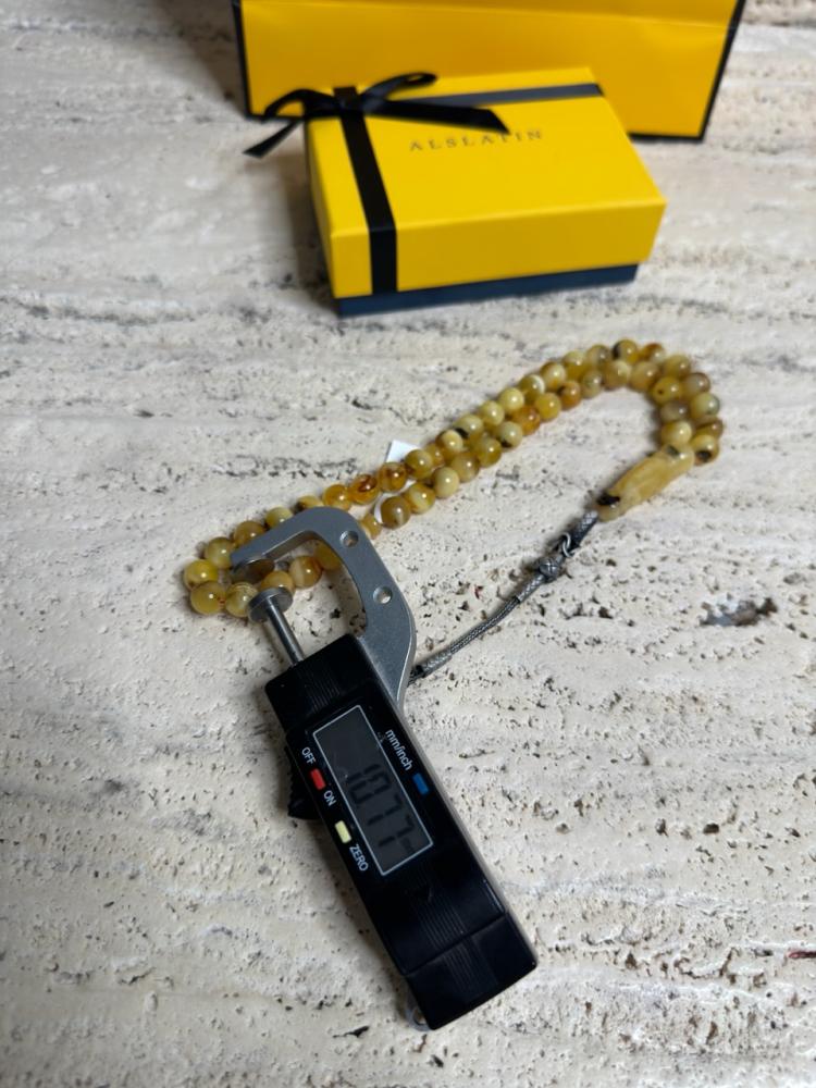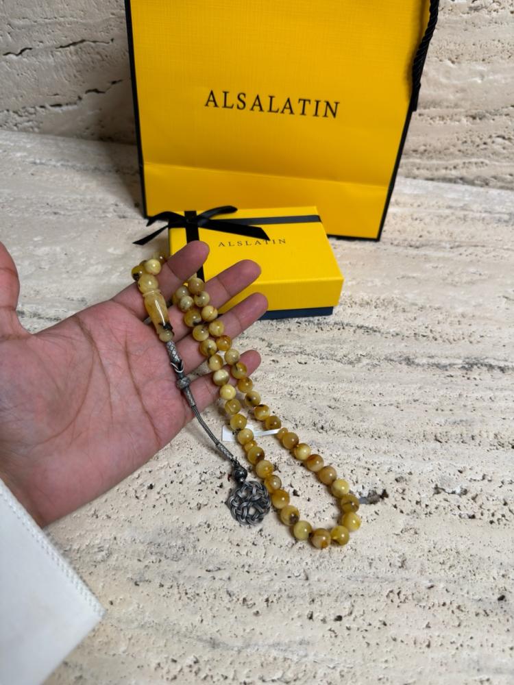 الكهرمان حجر عضوي ومن ميزته انه يكون خفيف الوزن واخف من اي سبحة ممكن تشوفه وصوت الخرز رنان يشبه صوت القزاز