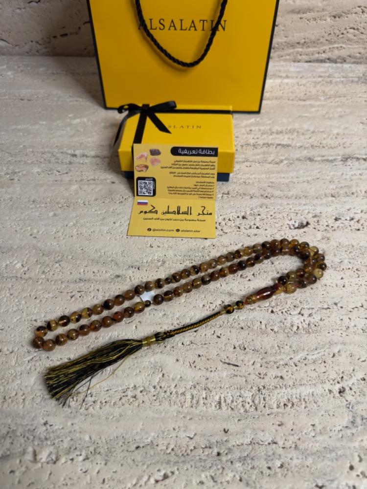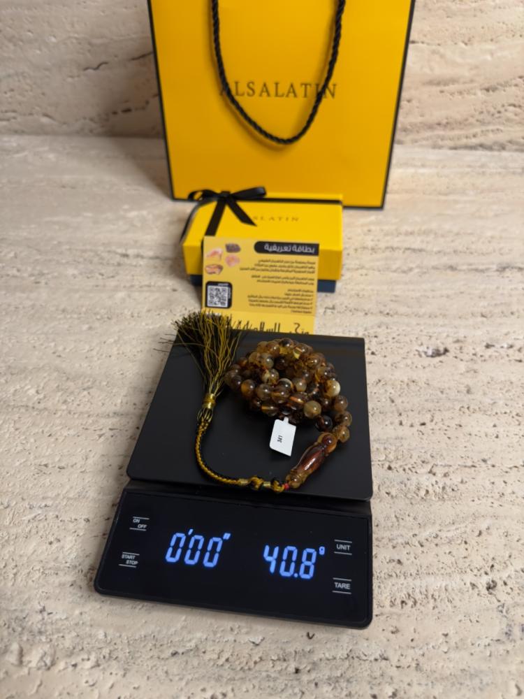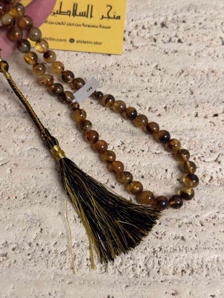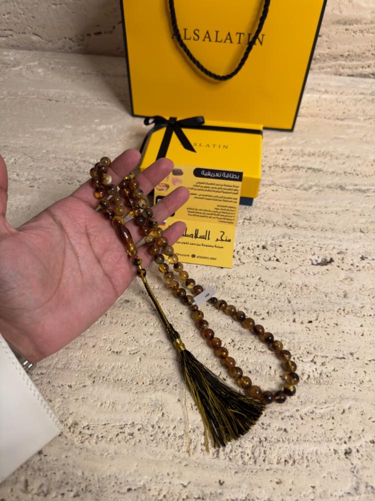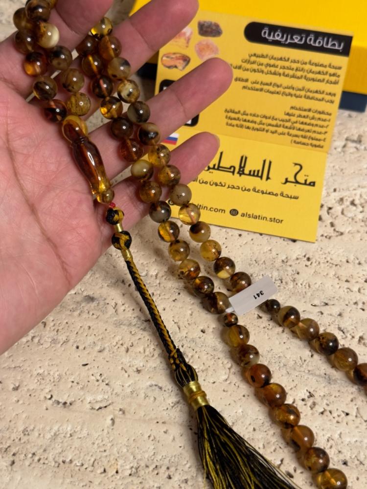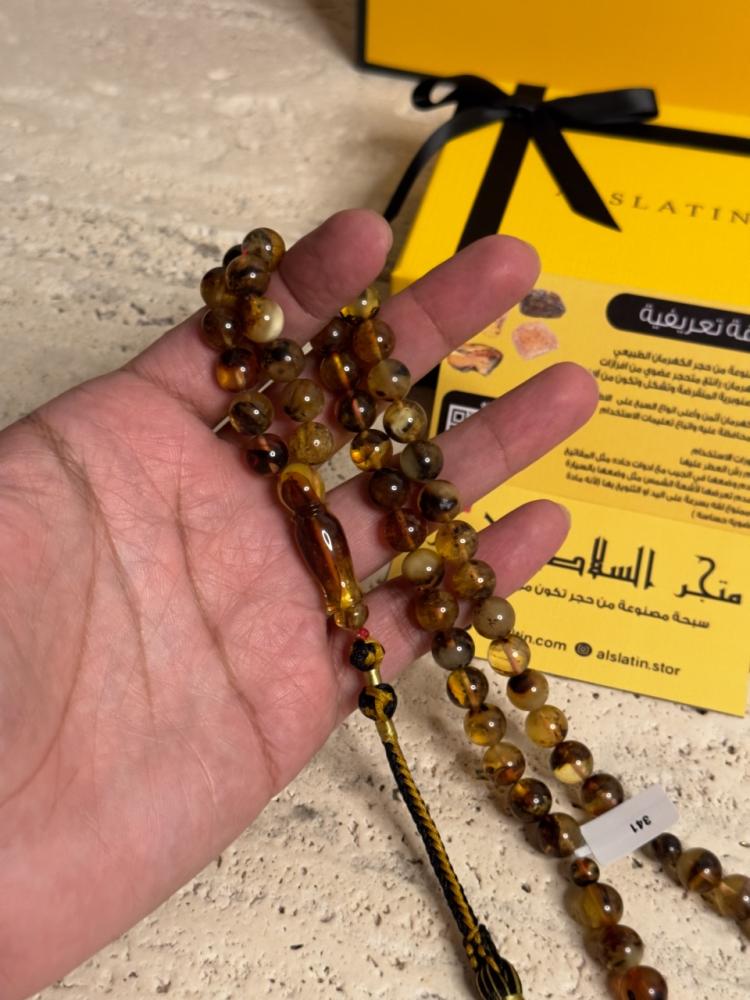 الكهرمان حجر عضوي ومن ميزته انه يكون خفيف الوزن واخف من اي سبحة ممكن تشوفه وصوت الخرز رنان يشبه صوت القزاز