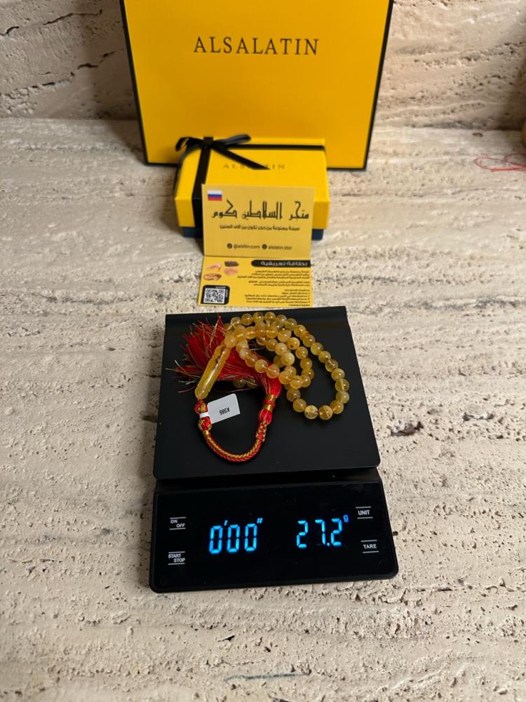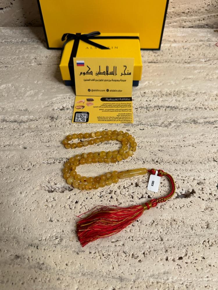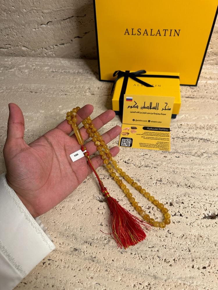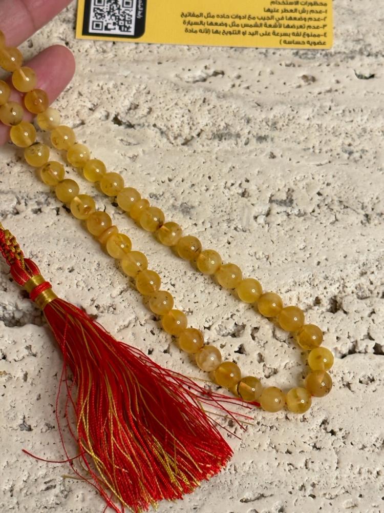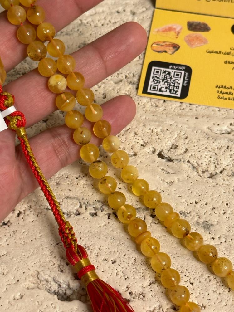 الكهرمان حجر عضوي ومن ميزته انه يكون خفيف الوزن واخف من اي سبحة ممكن تشوفه وصوت الخرز رنان يشبه صوت القزاز