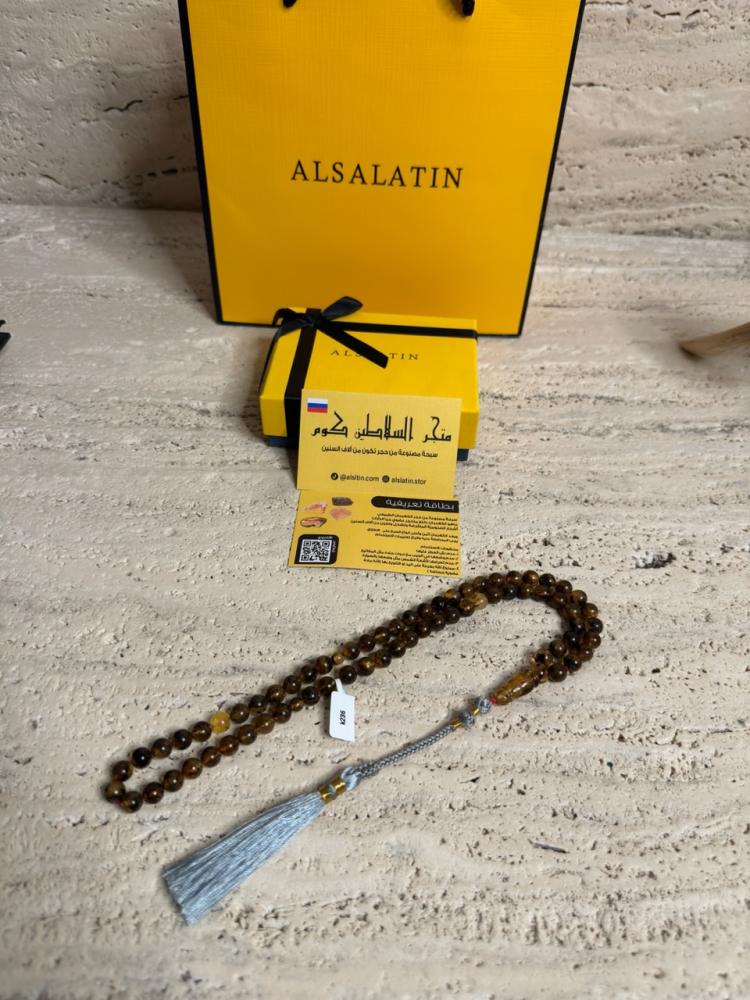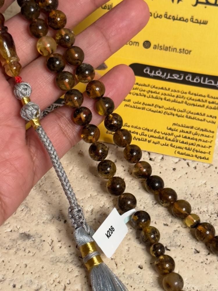 الكهرمان حجر عضوي ومن ميزته انه يكون خفيف الوزن واخف من اي سبحة ممكن تشوفه وصوت الخرز رنان يشبه صوت القزاز