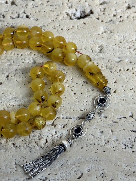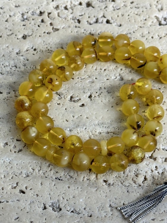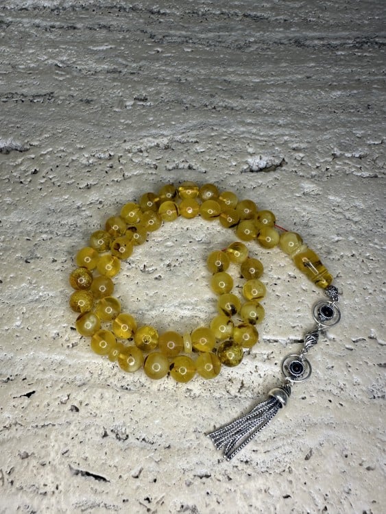 بعض الخرز او الشاهد قد يكون فيه شوائب ملموسه وهذا طبيعة الكهرمان الشوائب الطبيعية