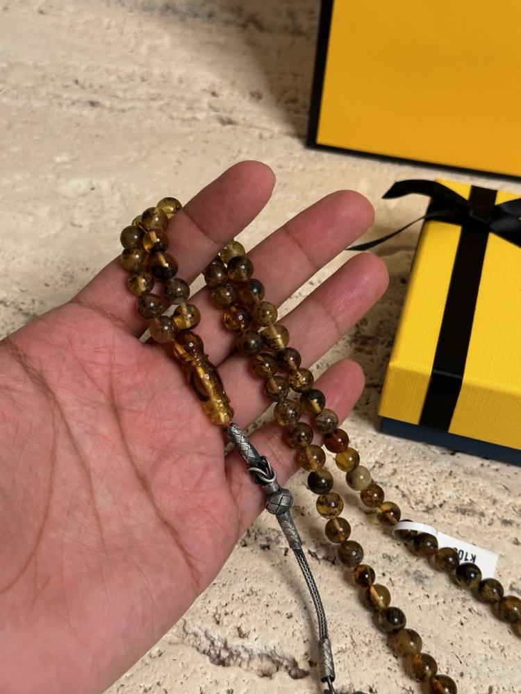 الكهرمان حجر عضوي ومن ميزته انه يكون خفيف الوزن واخف من اي سبحة ممكن تشوفه وصوت الخرز رنان يشبه صوت القزاز