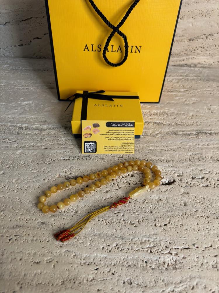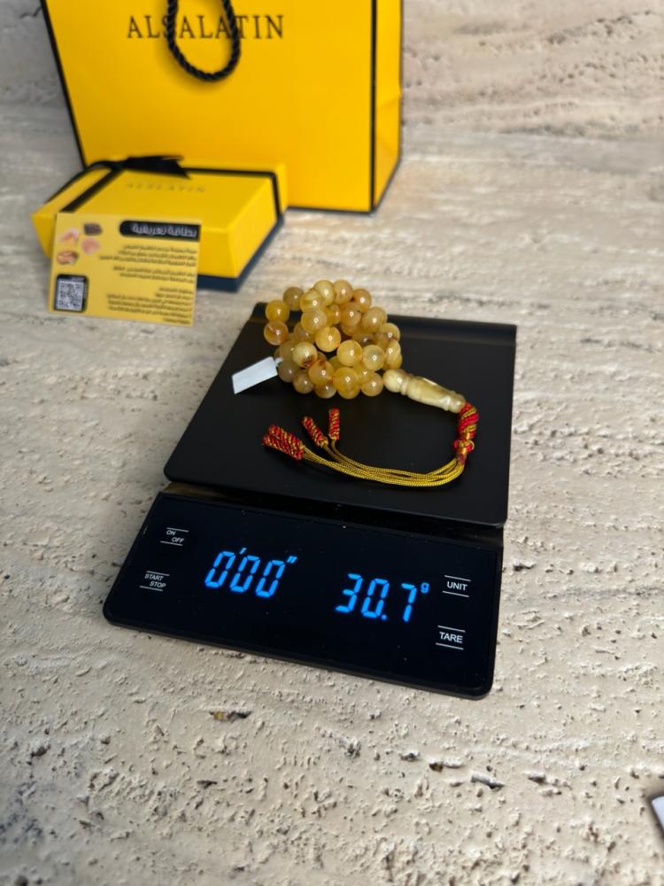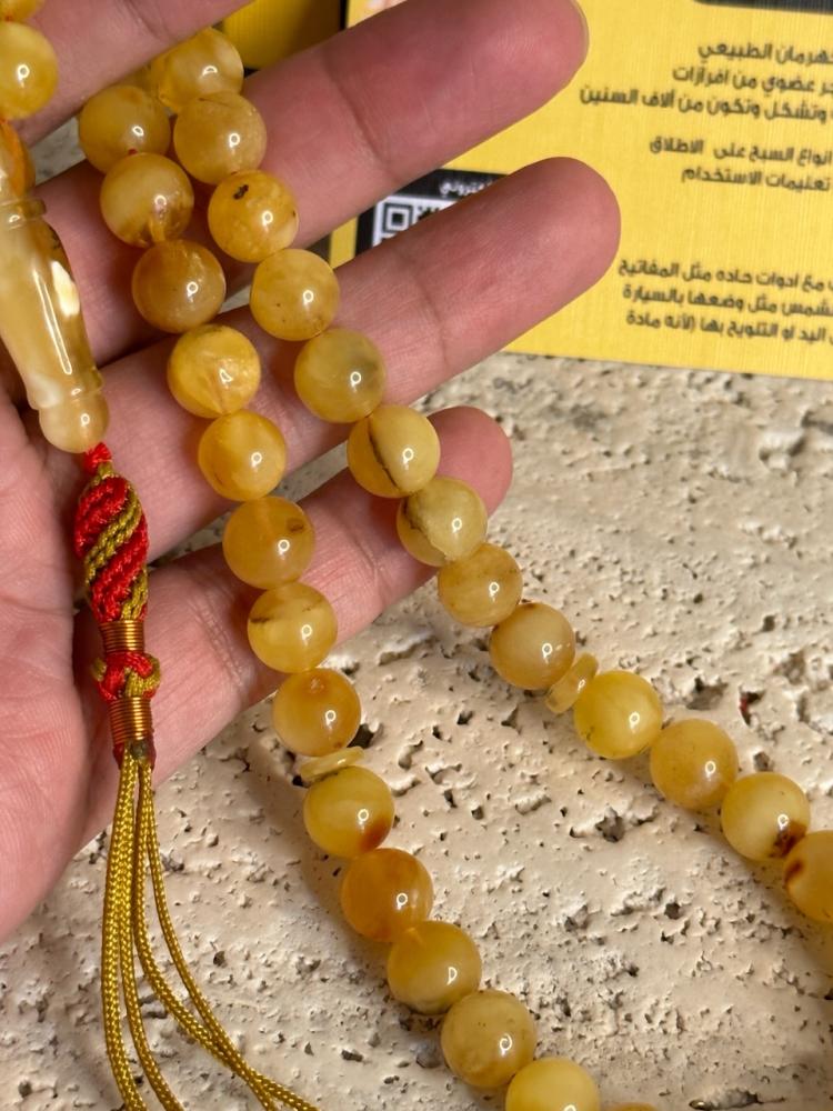 الكهرمان حجر عضوي ومن ميزته انه يكون خفيف الوزن واخف من اي سبحة ممكن تشوفه وصوت الخرز رنان يشبه صوت القزاز