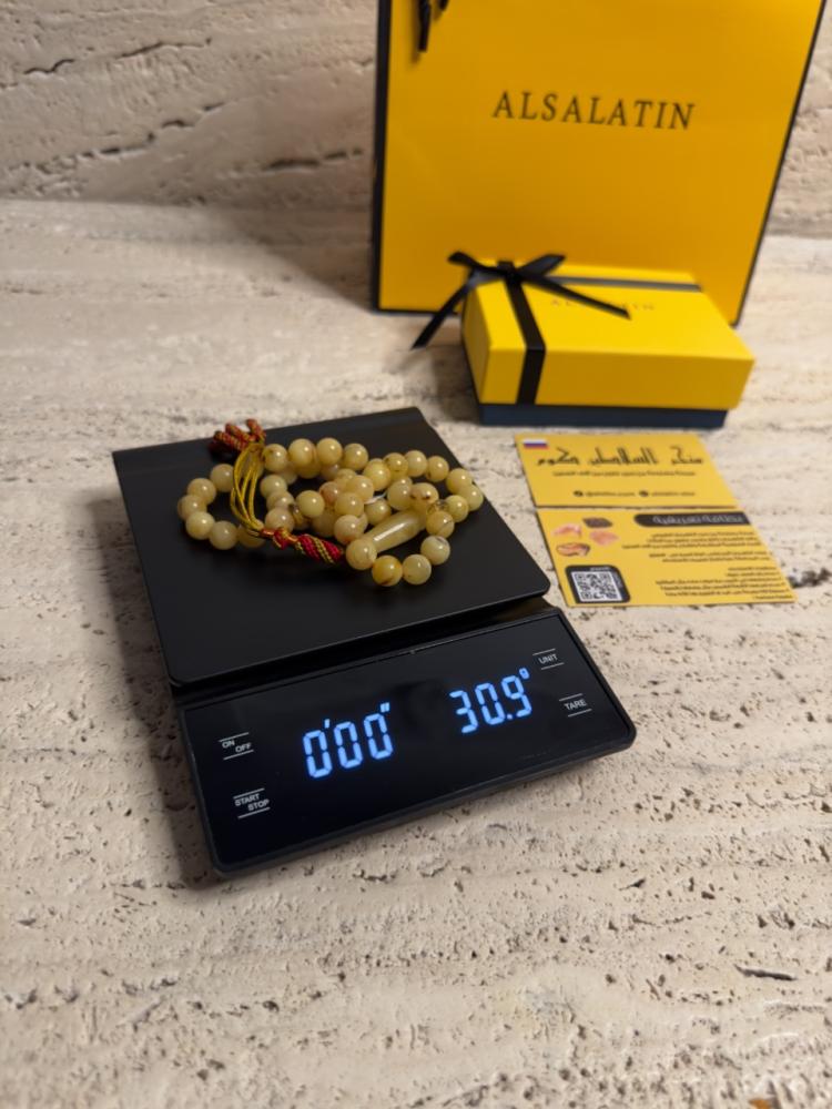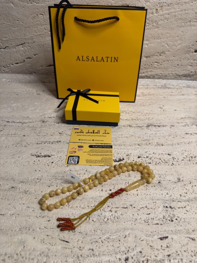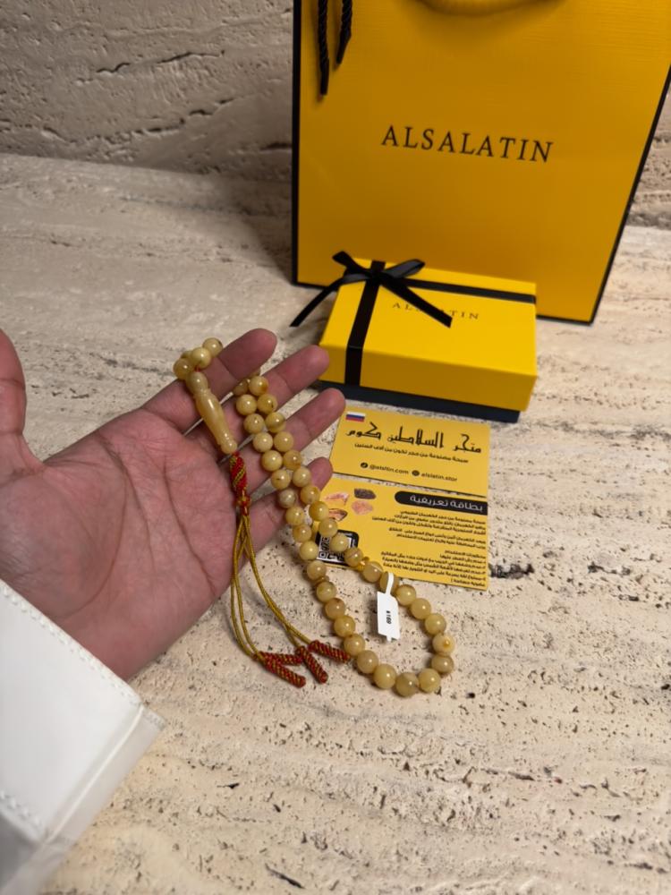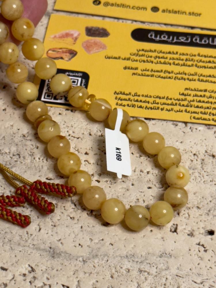 الكهرمان حجر عضوي ومن ميزته انه يكون خفيف الوزن واخف من اي سبحة ممكن تشوفه وصوت الخرز رنان يشبه صوت القزاز