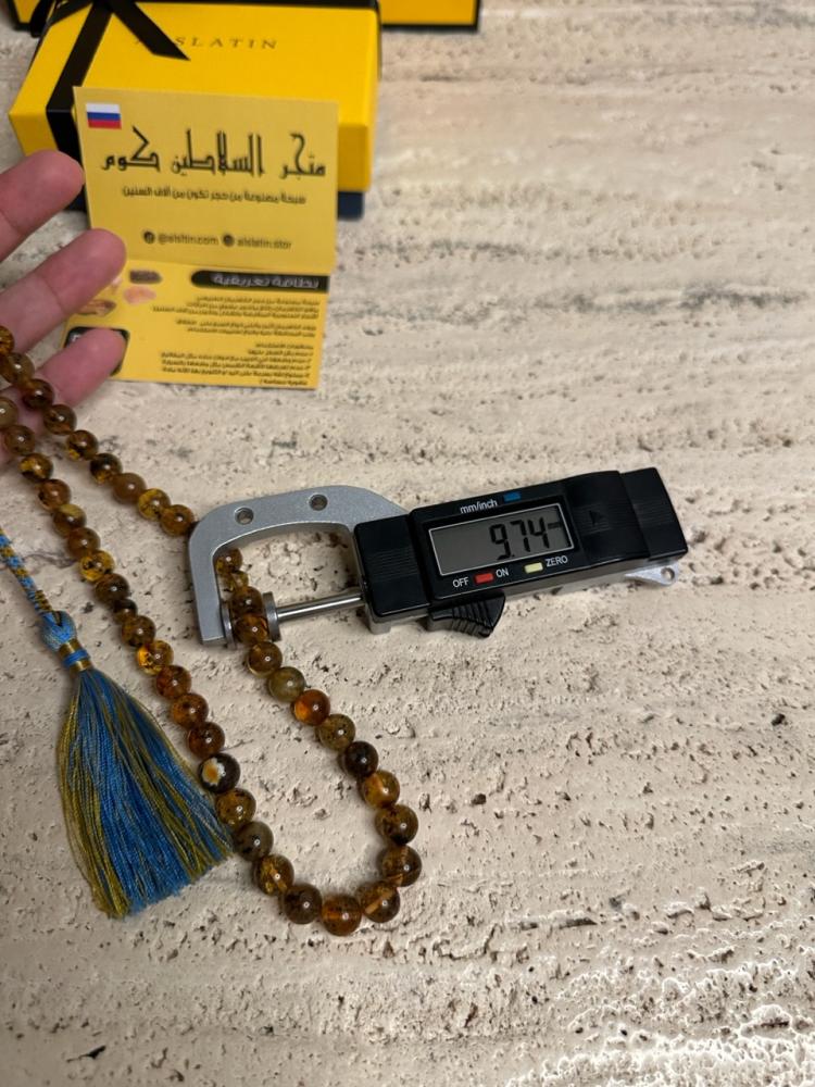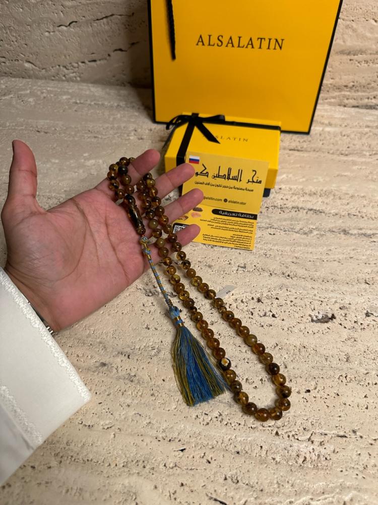 الكهرمان حجر عضوي ومن ميزته انه يكون خفيف الوزن واخف من اي سبحة ممكن تشوفه وصوت الخرز رنان يشبه صوت القزاز