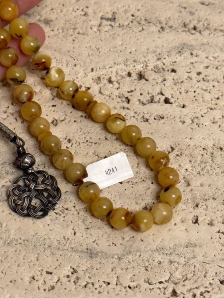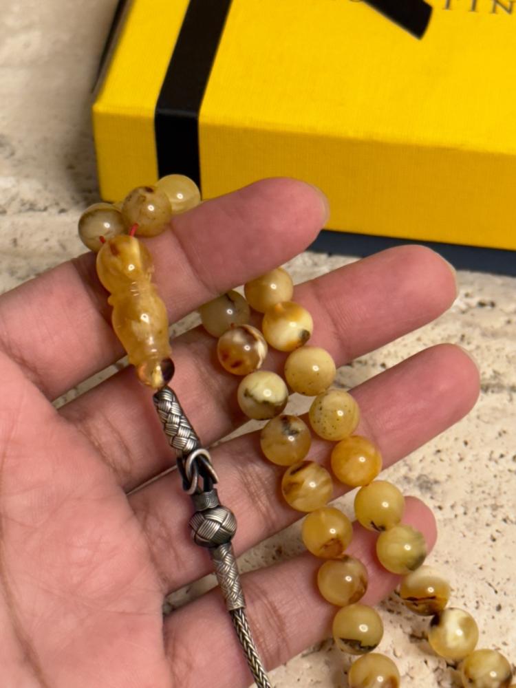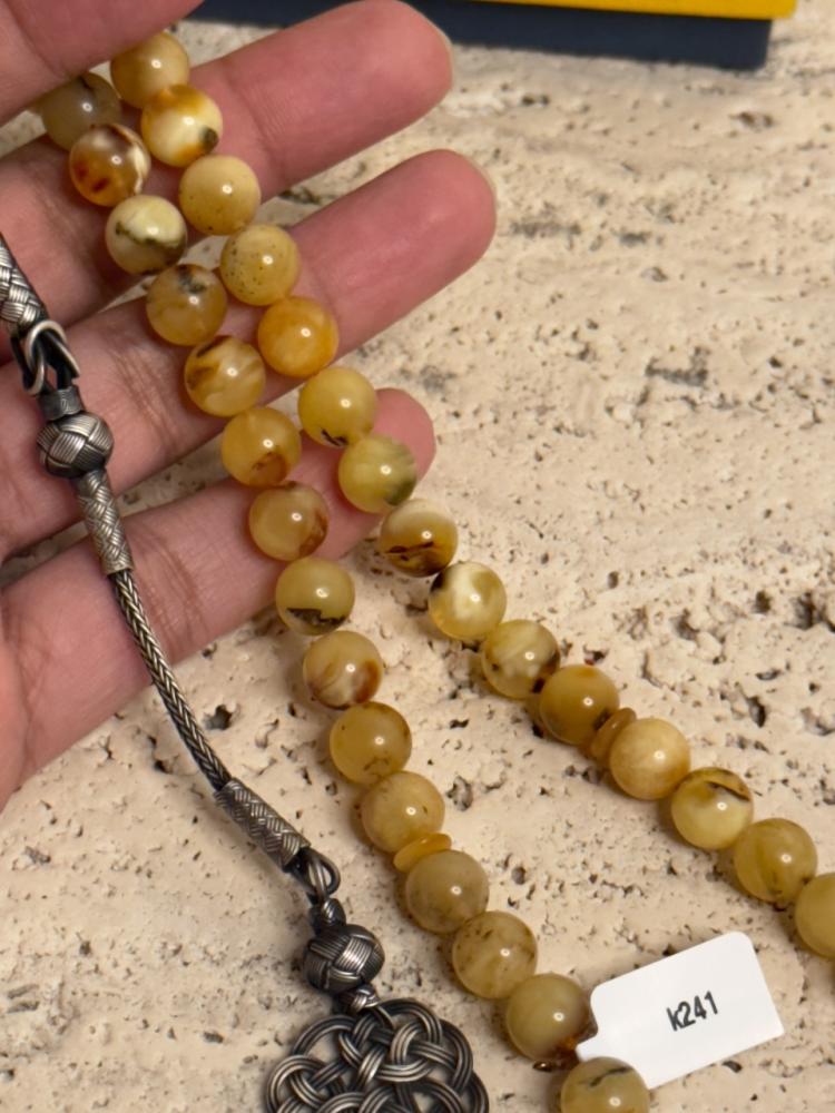 الكهرمان حجر عضوي ومن ميزته انه يكون خفيف الوزن واخف من اي سبحة ممكن تشوفه وصوت الخرز رنان يشبه صوت القزاز