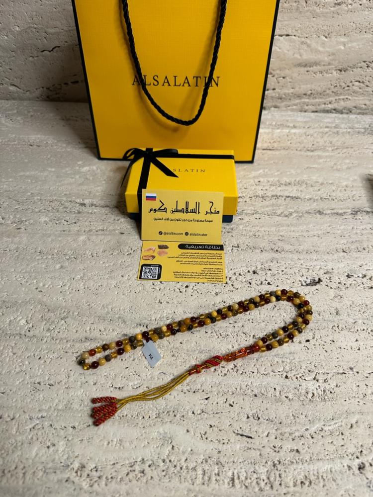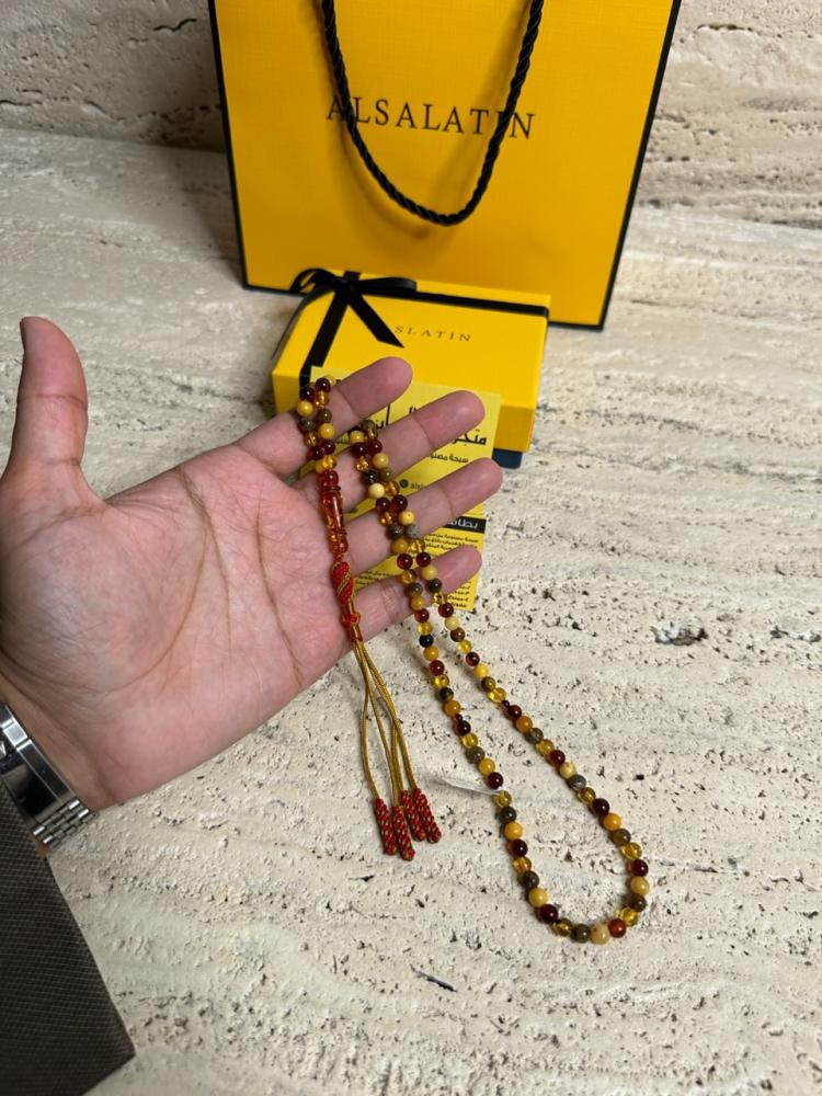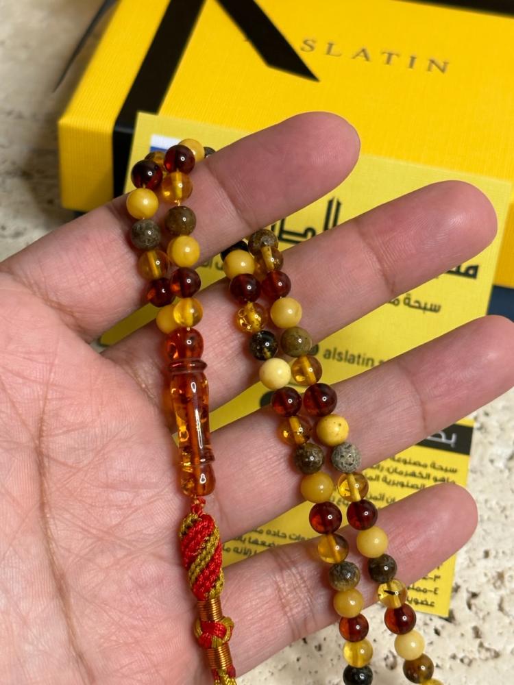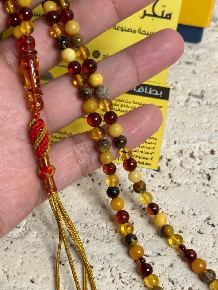 الكهرمان حجر عضوي ومن ميزته انه يكون خفيف الوزن واخف من اي سبحة ممكن تشوفه وصوت الخرز رنان يشبه صوت القزاز