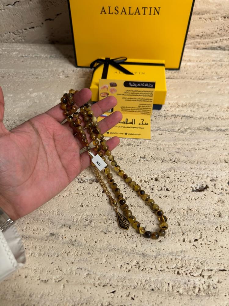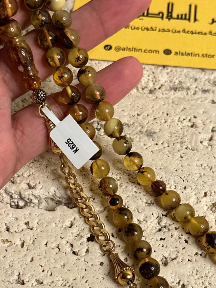 الكهرمان حجر عضوي ومن ميزته انه يكون خفيف الوزن واخف من اي سبحة ممكن تشوفه وصوت الخرز رنان يشبه صوت القزاز