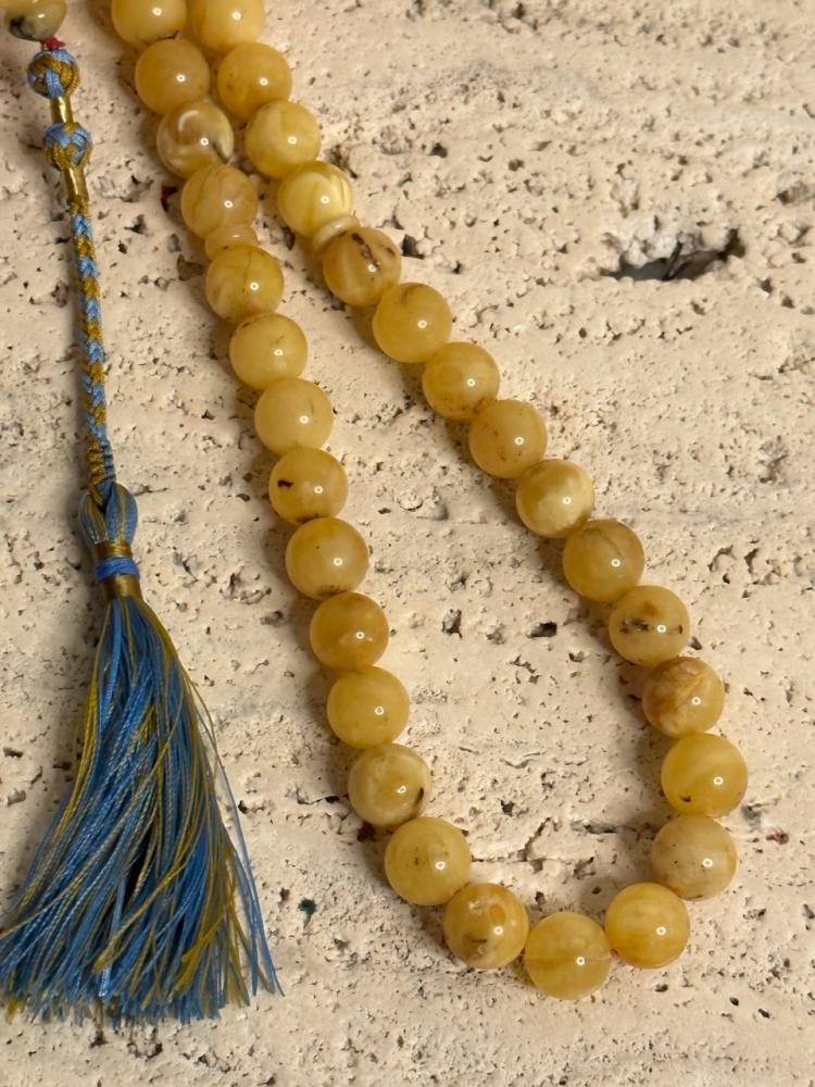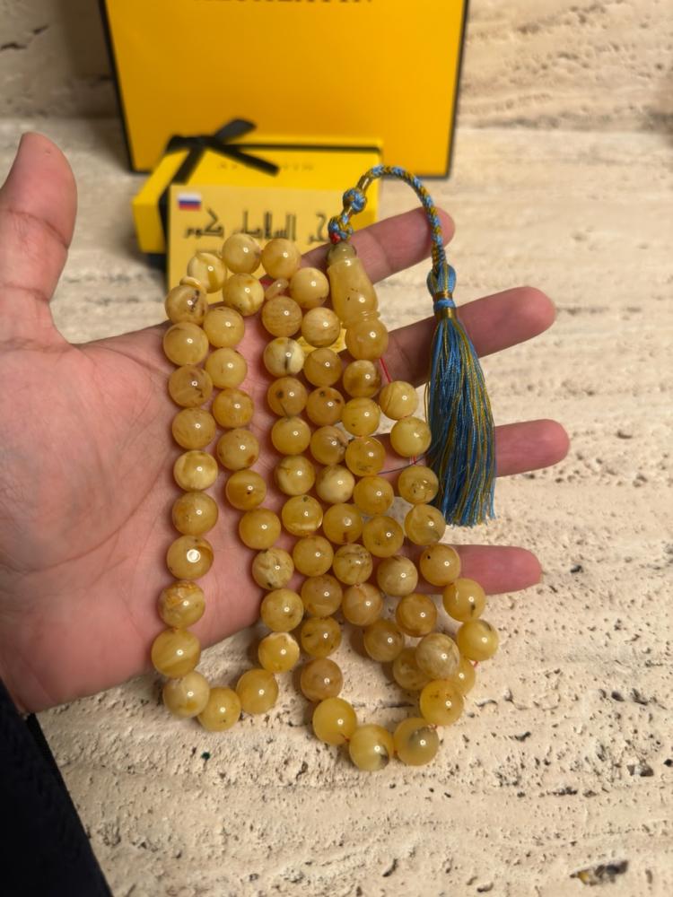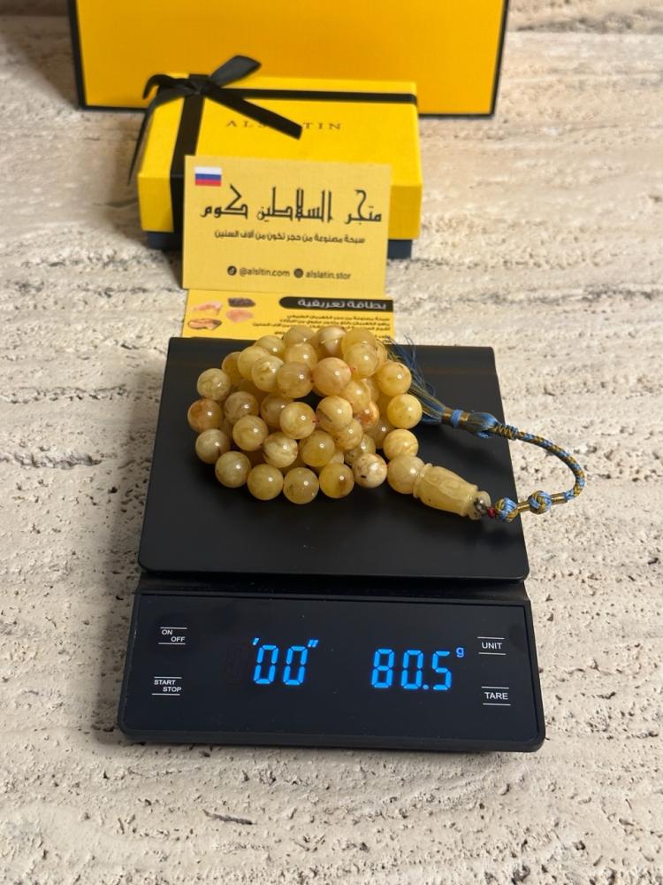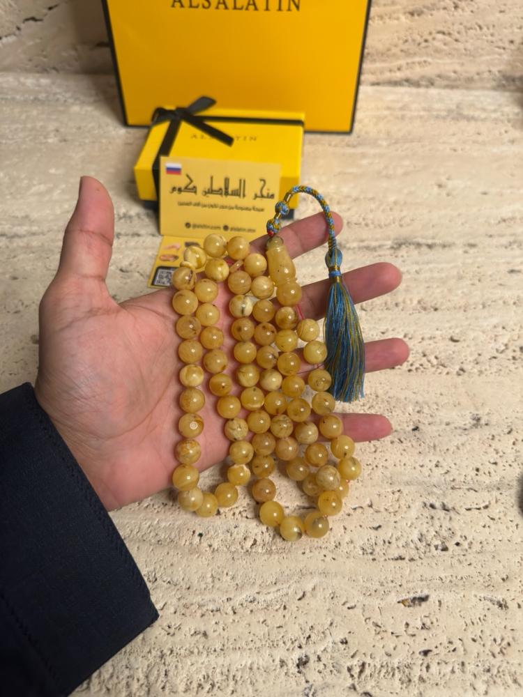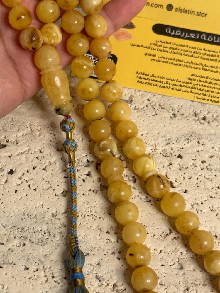 الكهرمان حجر عضوي ومن ميزته انه يكون خفيف الوزن واخف من اي سبحة ممكن تشوفه وصوت الخرز رنان يشبه صوت القزاز