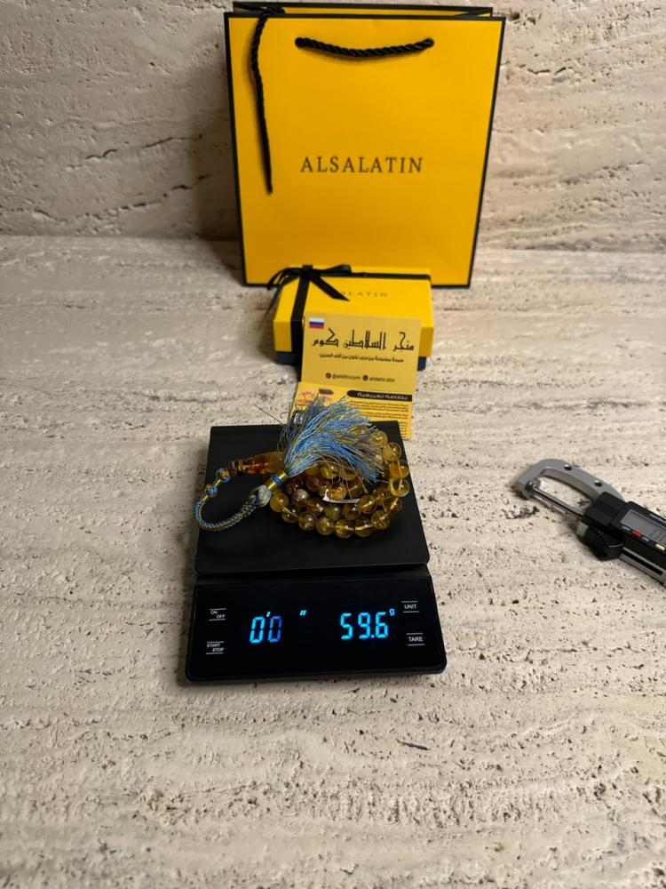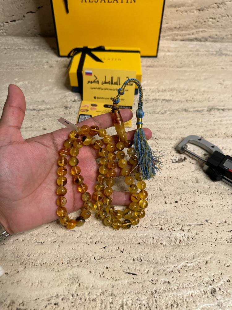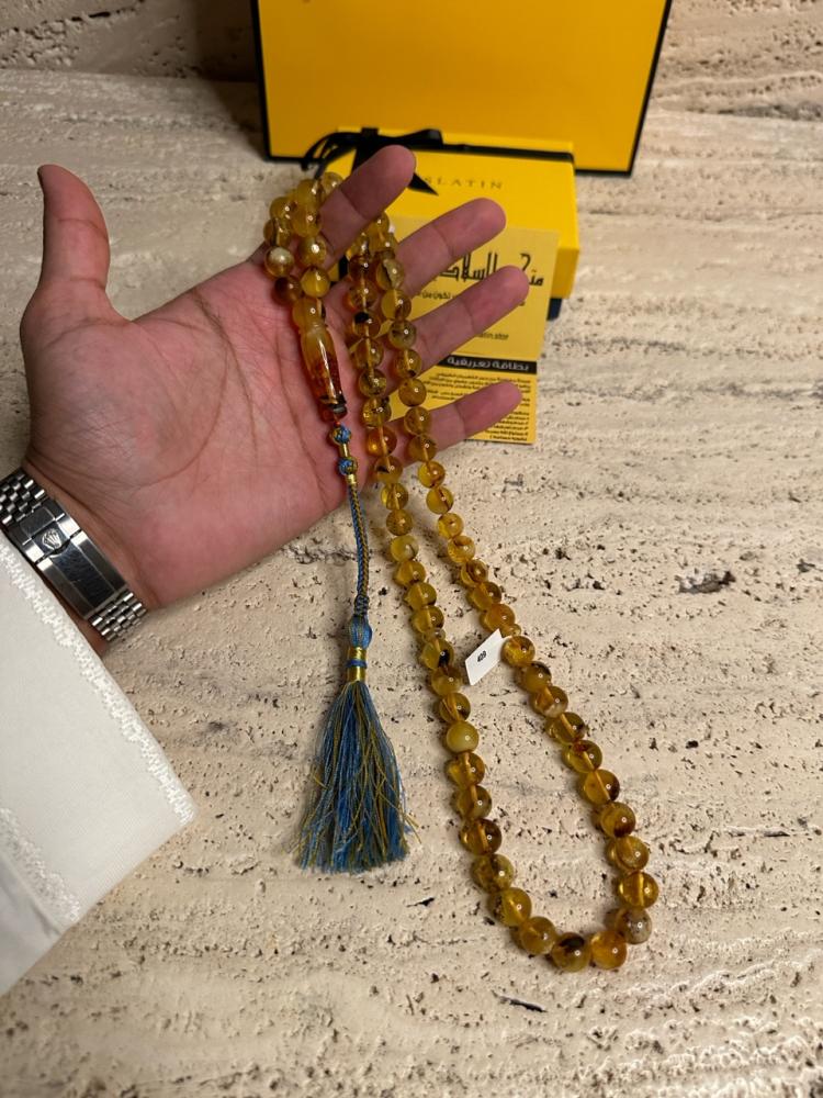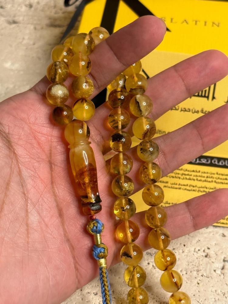 الكهرمان حجر عضوي ومن ميزته انه يكون خفيف الوزن واخف من اي سبحة ممكن تشوفه وصوت الخرز رنان يشبه صوت القزاز