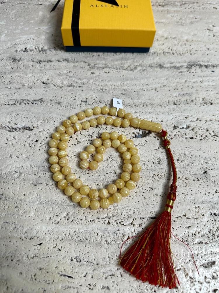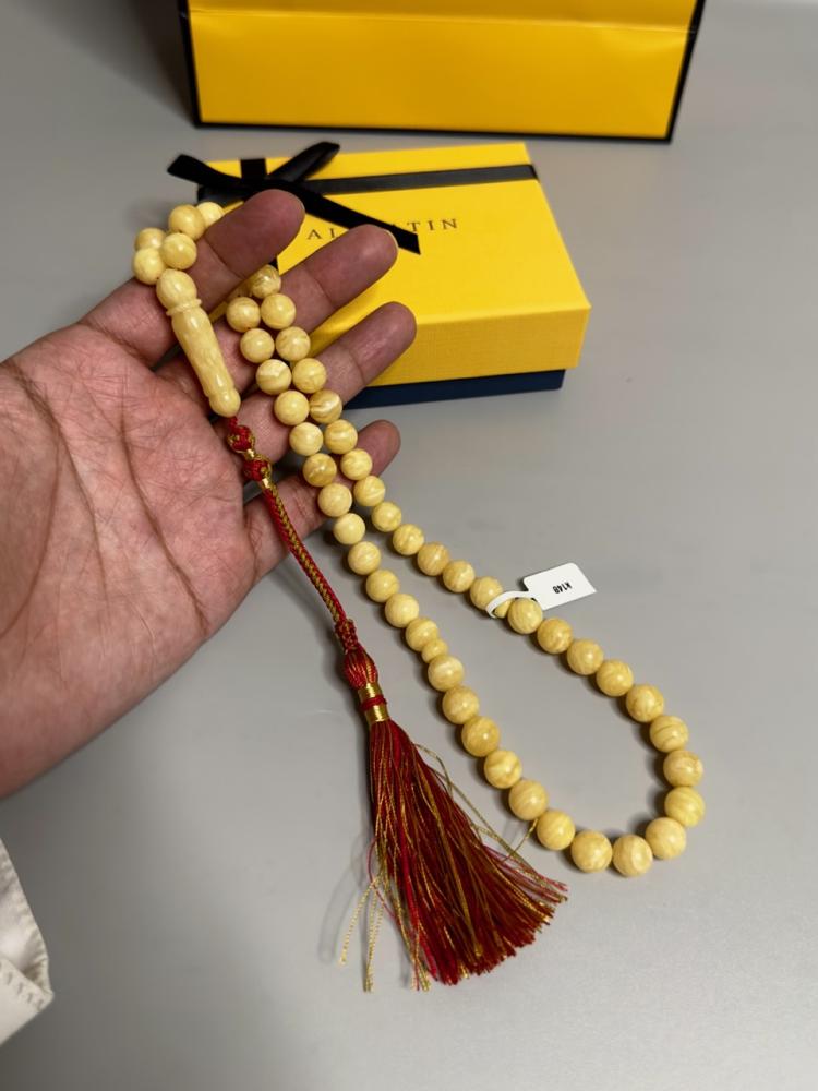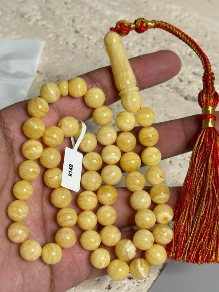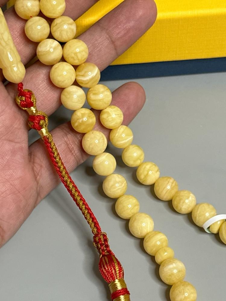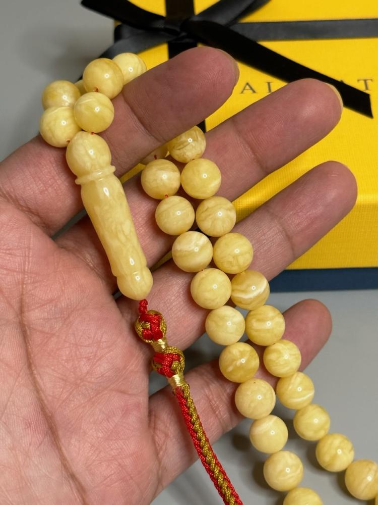 الكهرمان حجر عضوي ومن ميزته انه يكون خفيف الوزن واخف من اي سبحة ممكن تشوفه وصوت الخرز رنان يشبه صوت القزاز