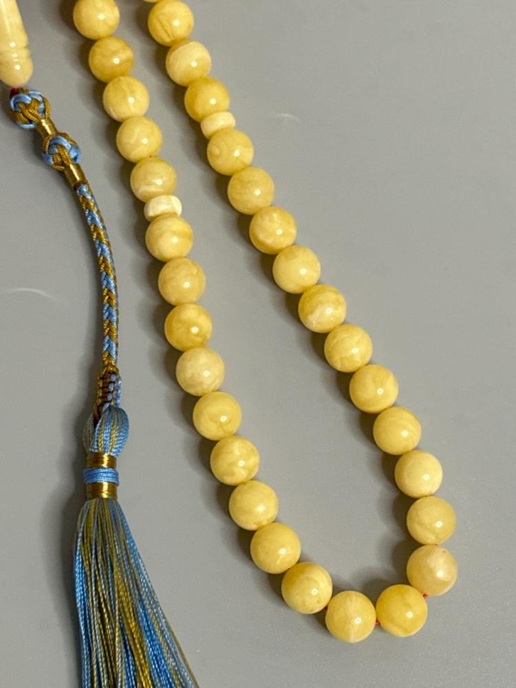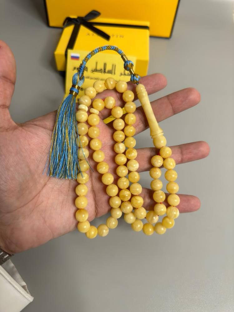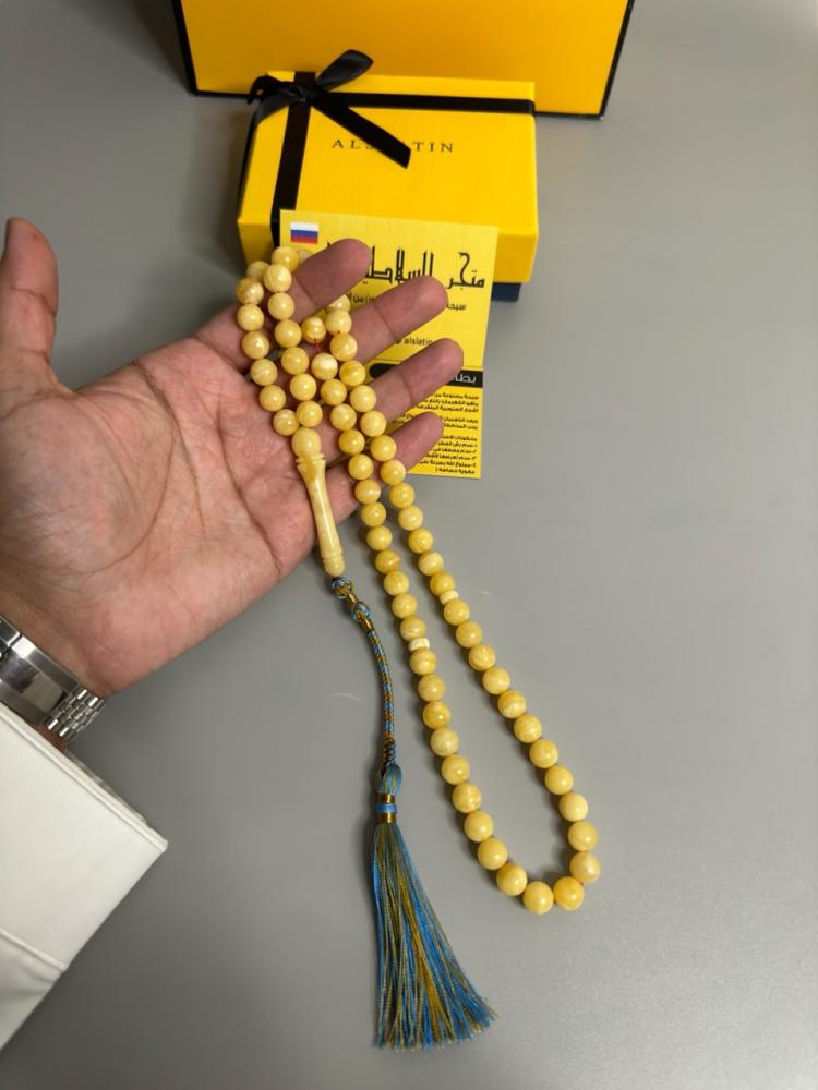 الكهرمان حجر عضوي ومن ميزته انه يكون خفيف الوزن واخف من اي سبحة ممكن تشوفه وصوت الخرز رنان يشبه صوت القزاز