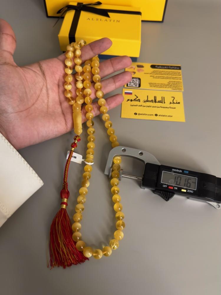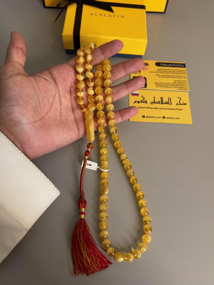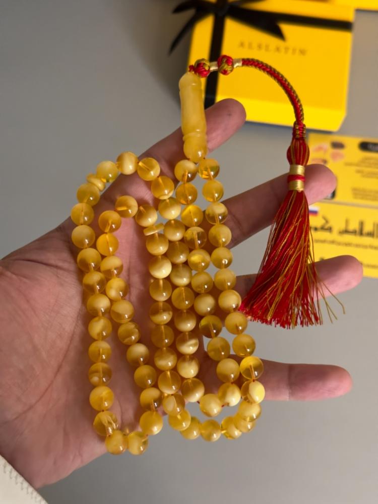 الكهرمان حجر عضوي ومن ميزته انه يكون خفيف الوزن واخف من اي سبحة ممكن تشوفه وصوت الخرز رنان يشبه صوت القزاز
