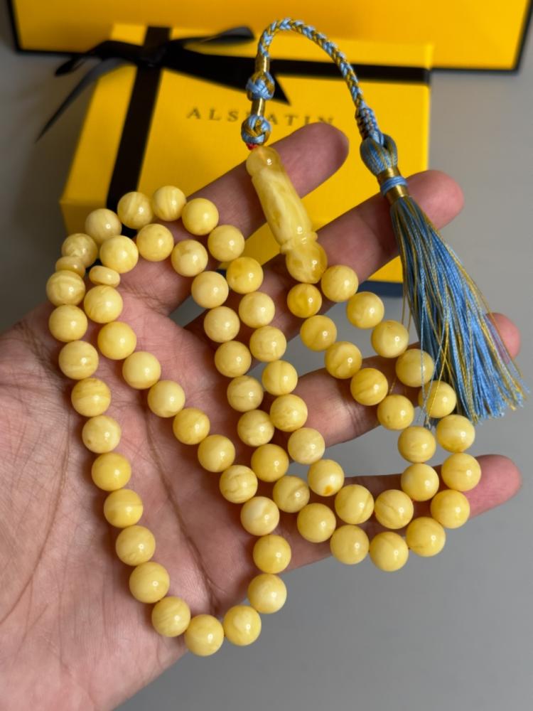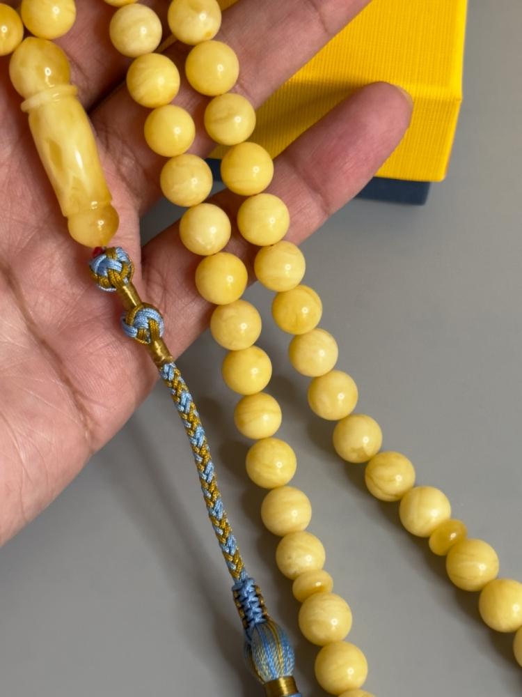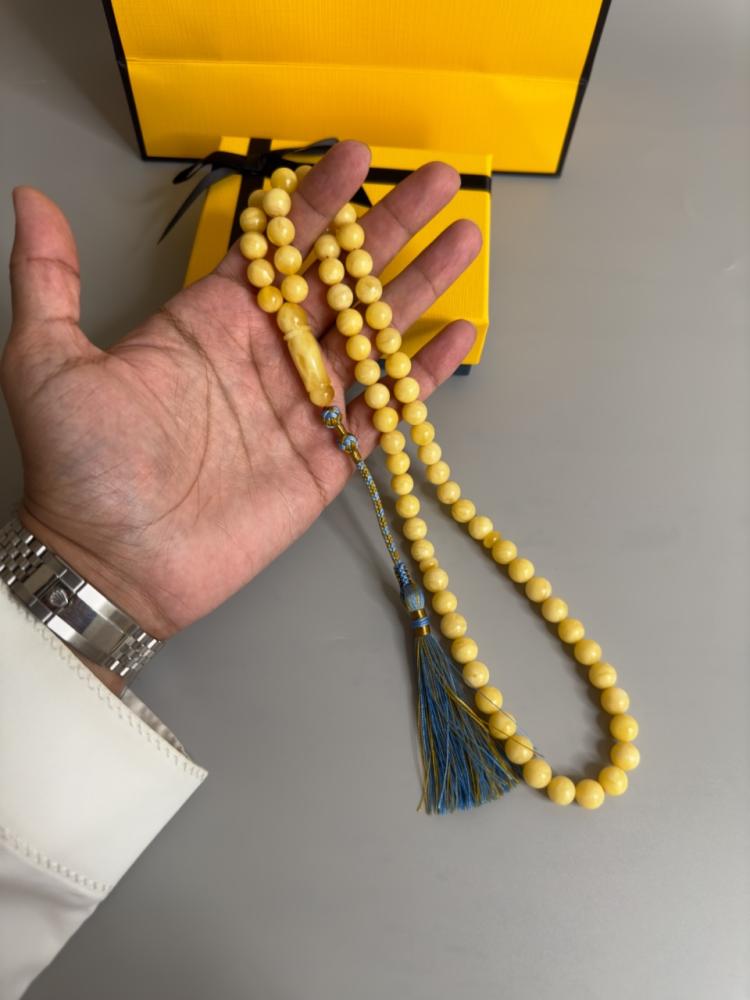 الكهرمان حجر عضوي ومن ميزته انه يكون خفيف الوزن واخف من اي سبحة ممكن تشوفه وصوت الخرز رنان يشبه صوت القزاز