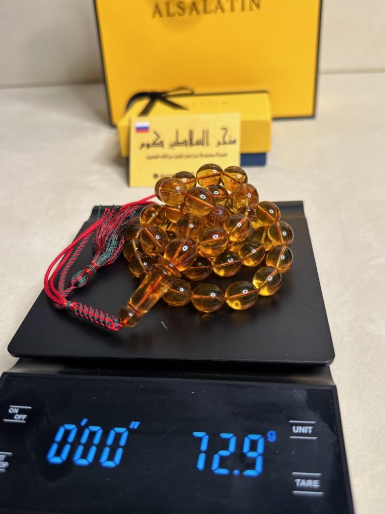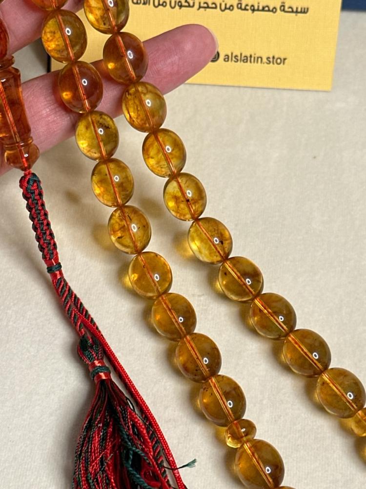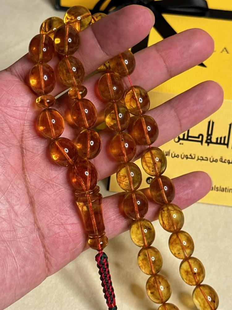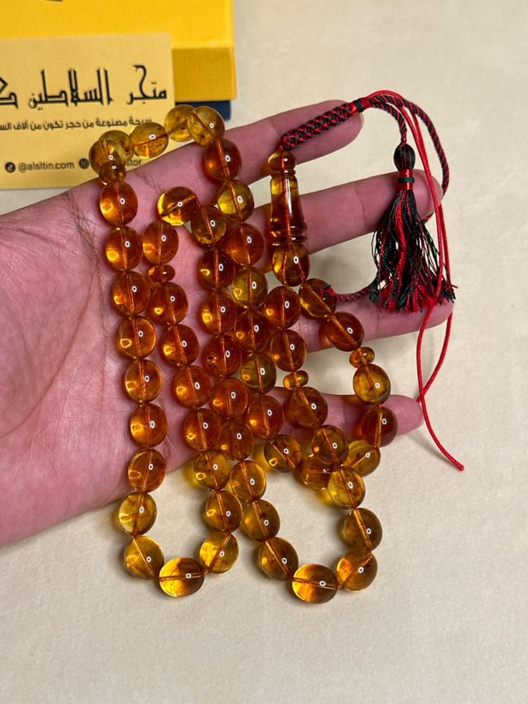 الكهرمان حجر عضوي ومن ميزته انه يكون خفيف الوزن واخف من اي سبحة ممكن تشوفه وصوت الخرز رنان يشبه صوت القزاز