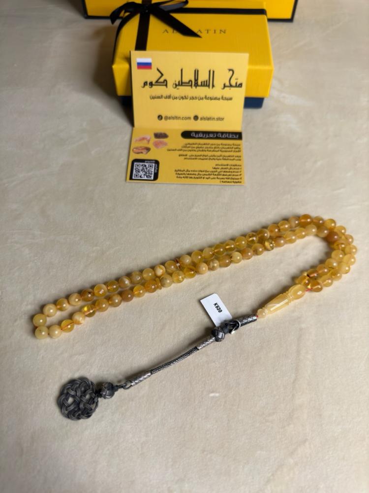 الكهرمان حجر عضوي ومن ميزته انه يكون خفيف الوزن واخف من اي سبحة ممكن تشوفه وصوت الخرز رنان يشبه صوت القزاز