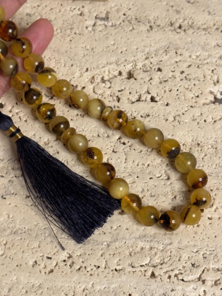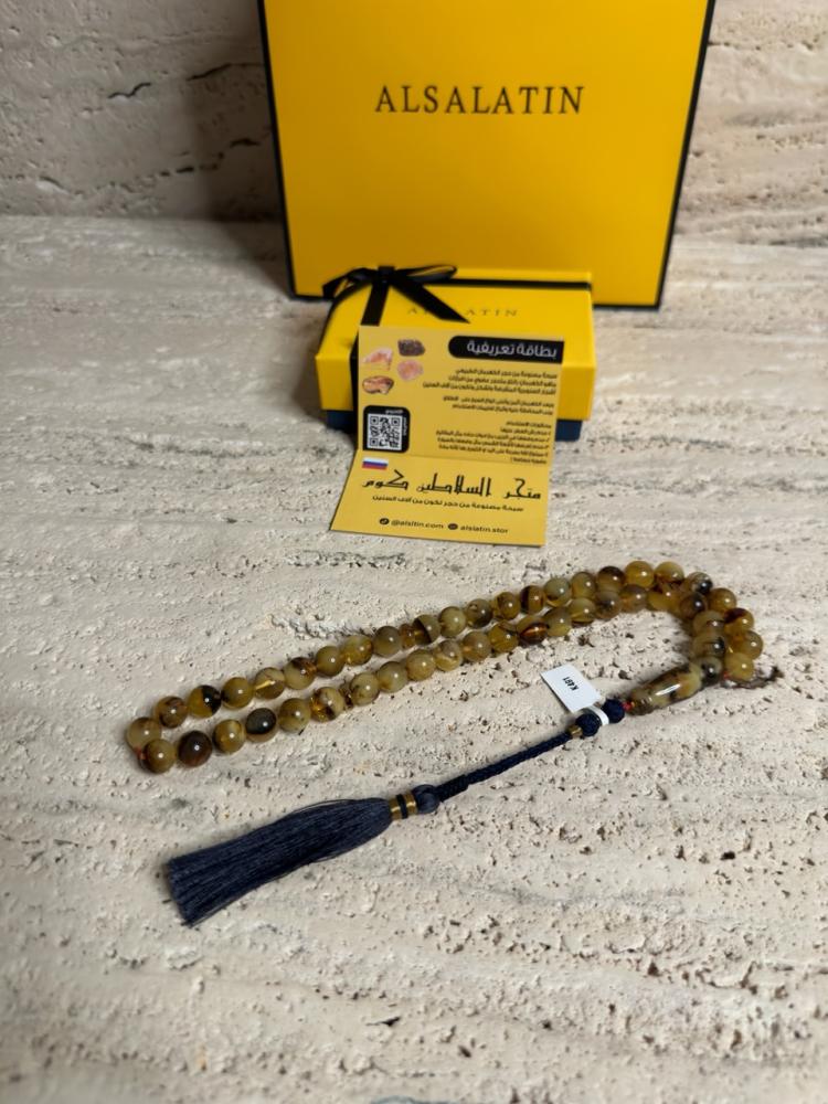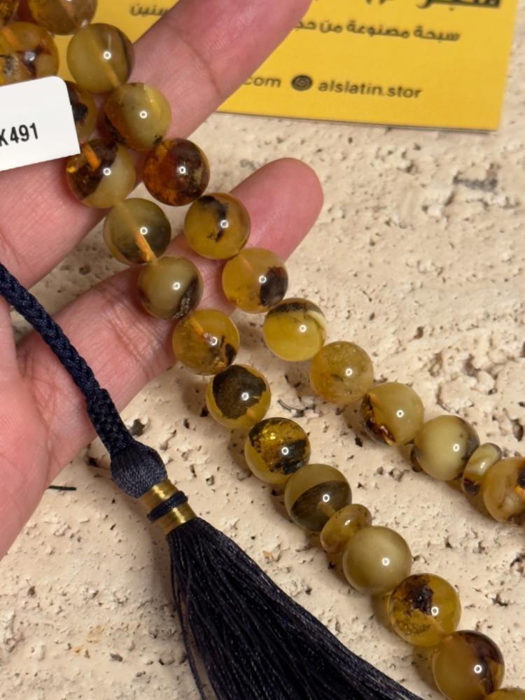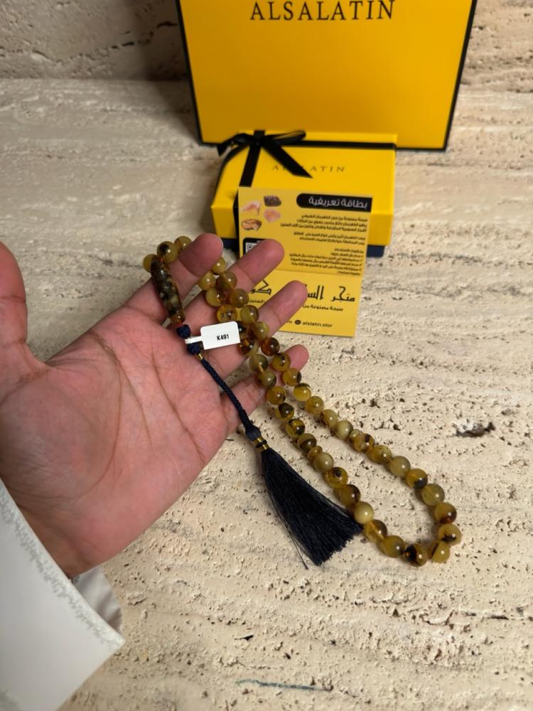 الكهرمان حجر عضوي ومن ميزته انه يكون خفيف الوزن واخف من اي سبحة ممكن تشوفه وصوت الخرز رنان يشبه صوت القزاز