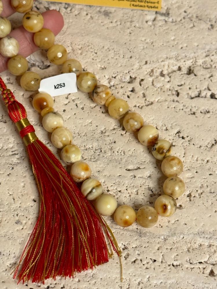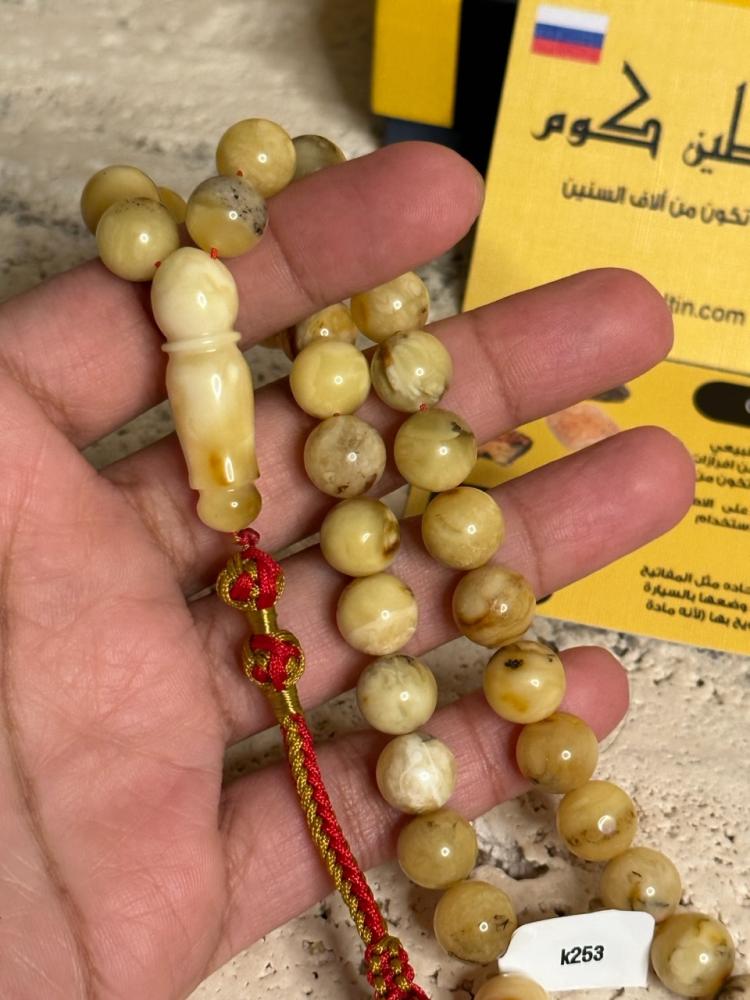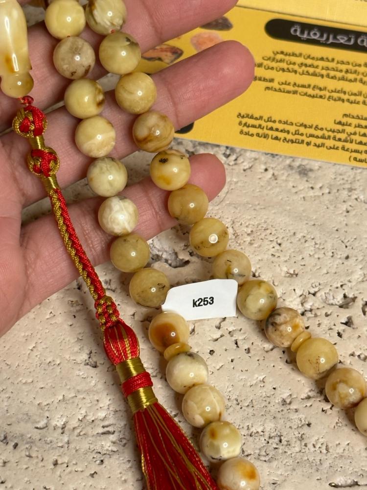 الكهرمان حجر عضوي ومن ميزته انه يكون خفيف الوزن واخف من اي سبحة ممكن تشوفه وصوت الخرز رنان يشبه صوت القزاز