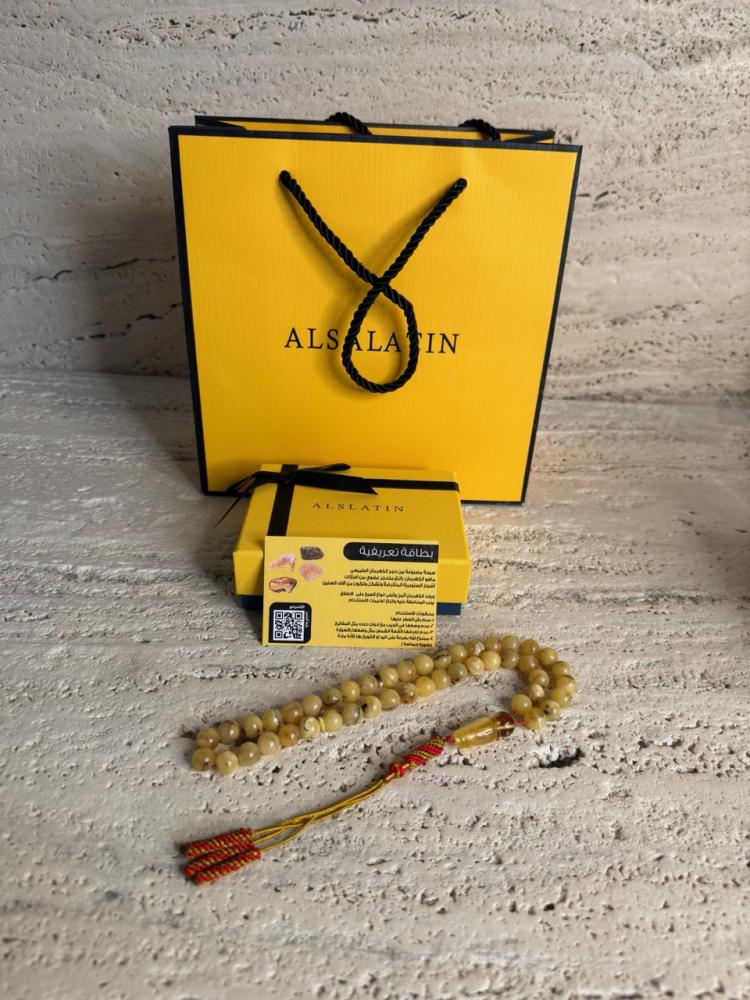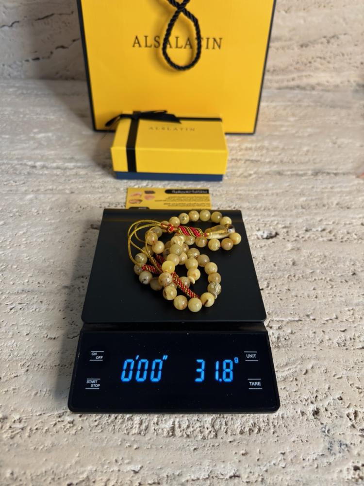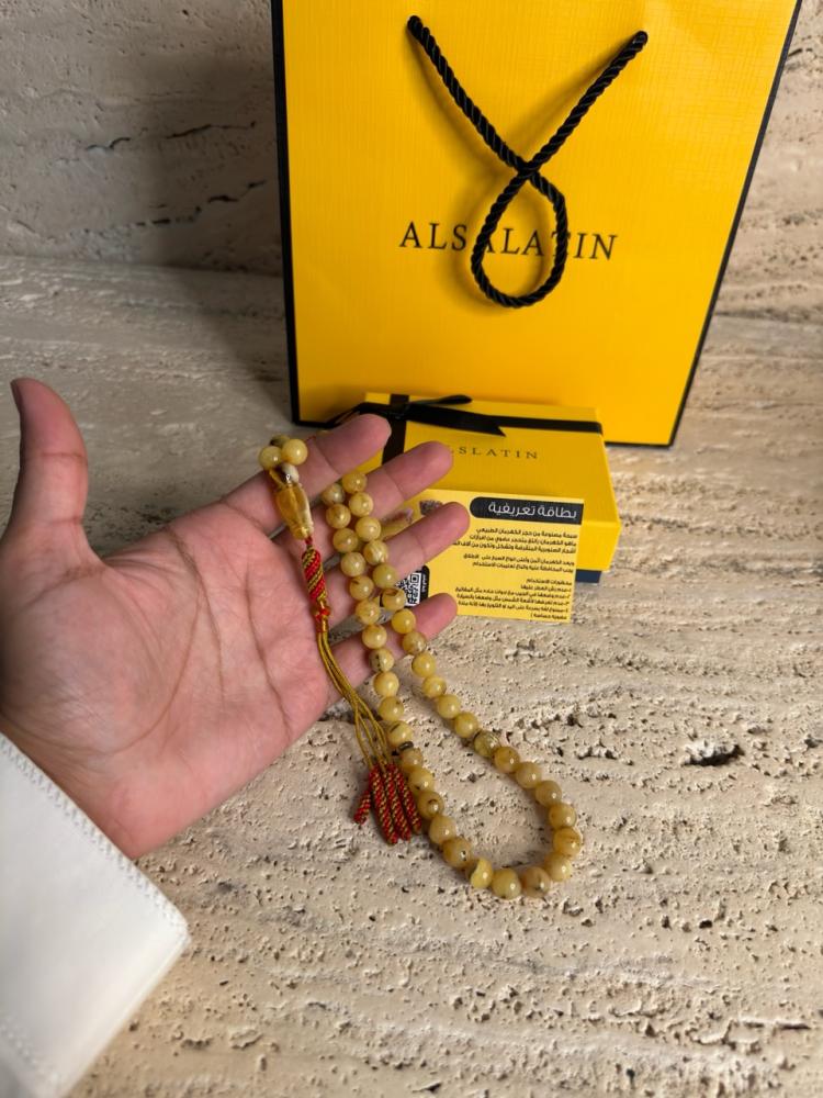 الكهرمان حجر عضوي ومن ميزته انه يكون خفيف الوزن واخف من اي سبحة ممكن تشوفه وصوت الخرز رنان يشبه صوت القزاز