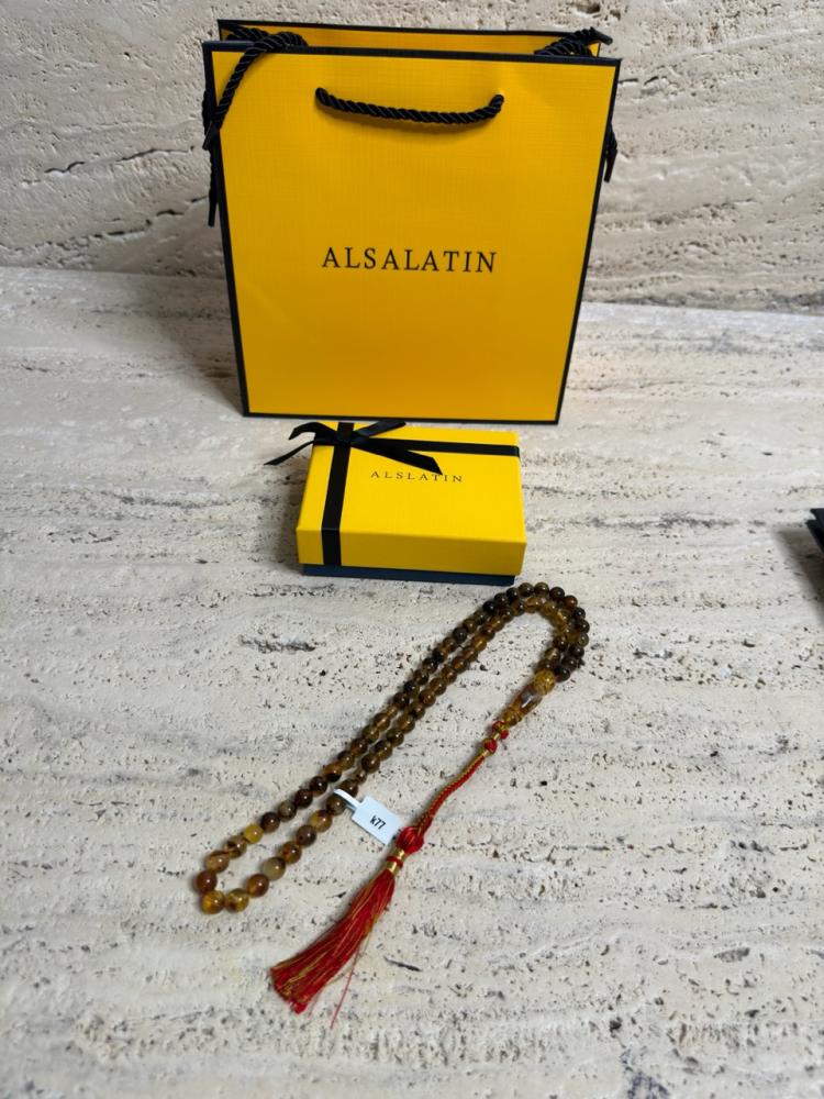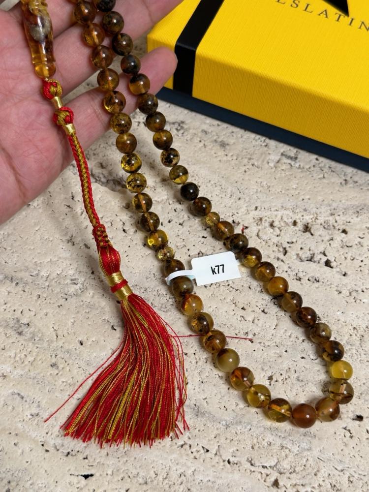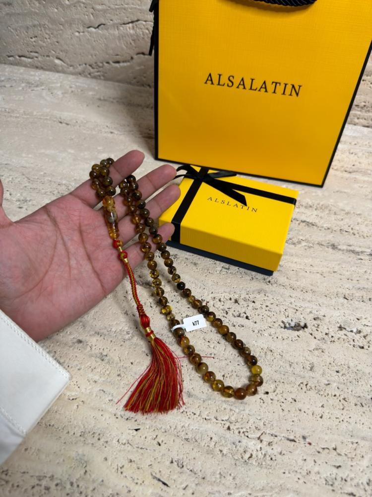 الكهرمان حجر عضوي ومن ميزته انه يكون خفيف الوزن واخف من اي سبحة ممكن تشوفه وصوت الخرز رنان يشبه صوت القزاز