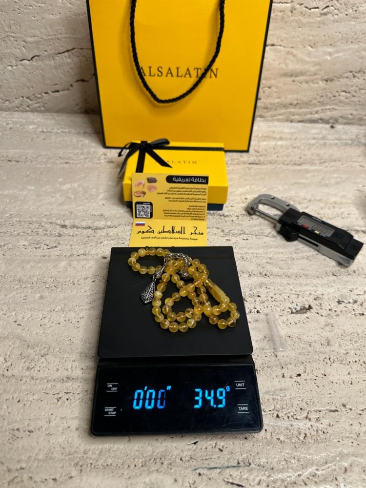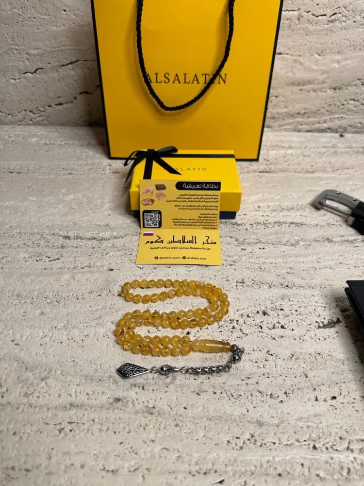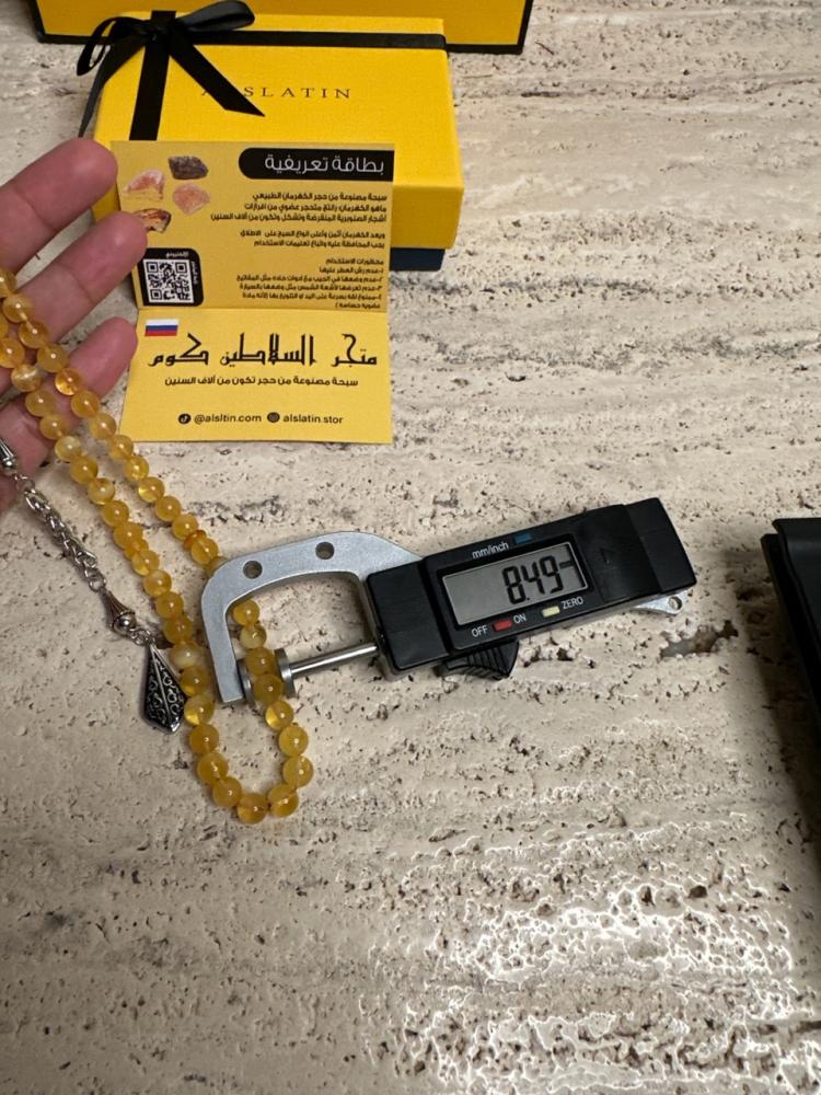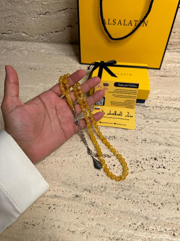 الكهرمان حجر عضوي ومن ميزته انه يكون خفيف الوزن واخف من اي سبحة ممكن تشوفه وصوت الخرز رنان يشبه صوت القزاز