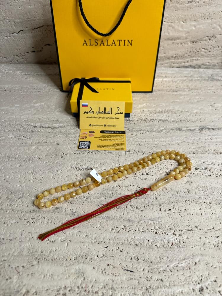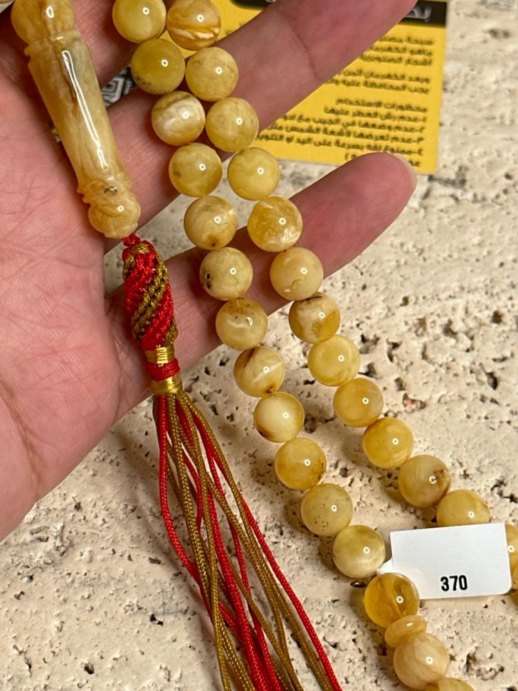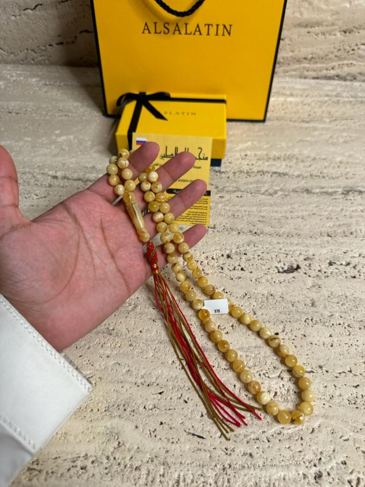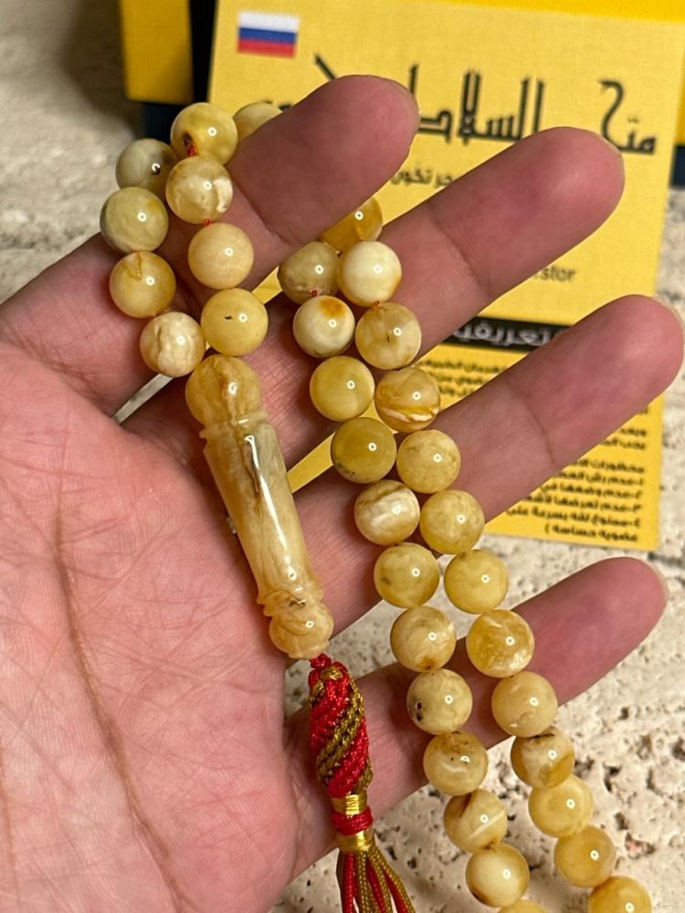 الكهرمان حجر عضوي ومن ميزته انه يكون خفيف الوزن واخف من اي سبحة ممكن تشوفه وصوت الخرز رنان يشبه صوت القزاز
