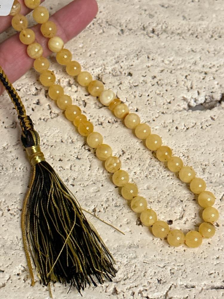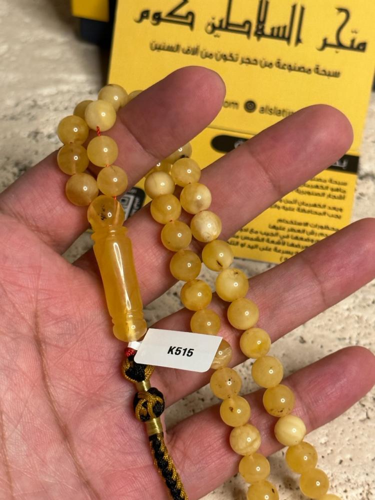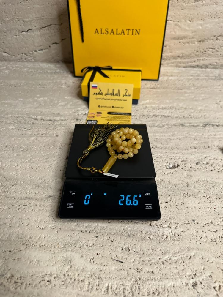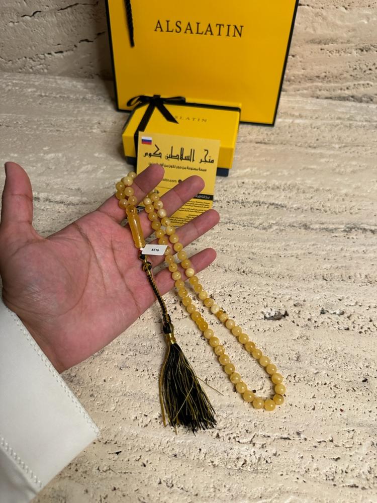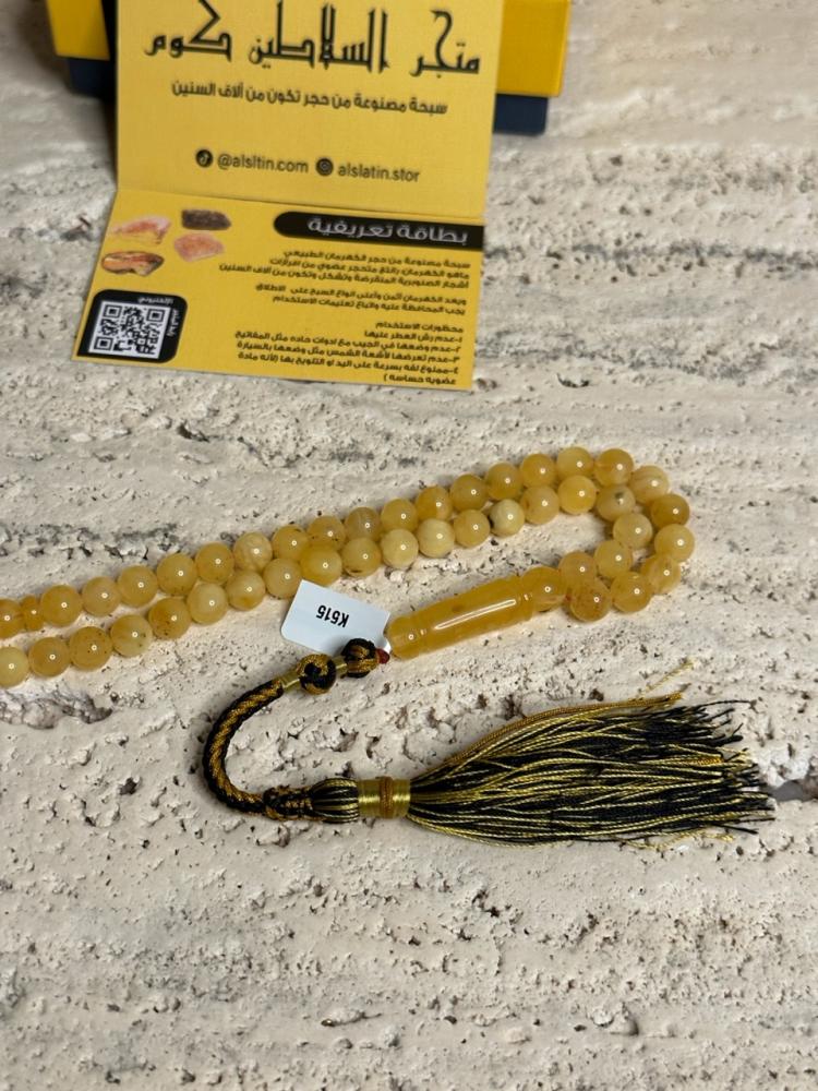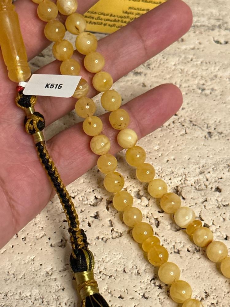 الكهرمان حجر عضوي ومن ميزته انه يكون خفيف الوزن واخف من اي سبحة ممكن تشوفه وصوت الخرز رنان يشبه صوت القزاز