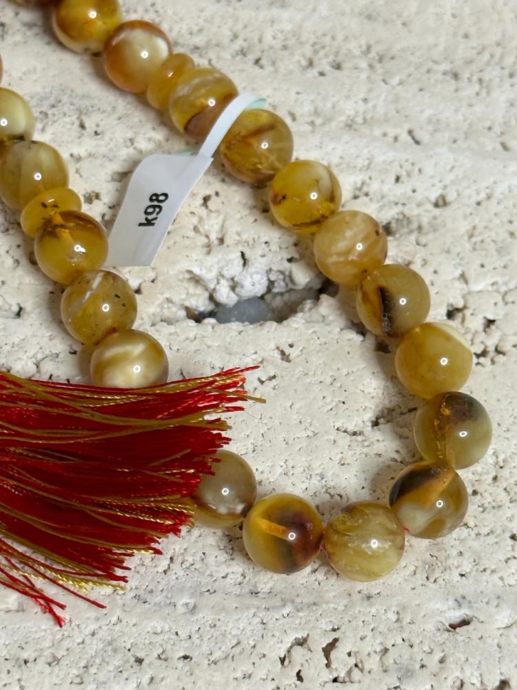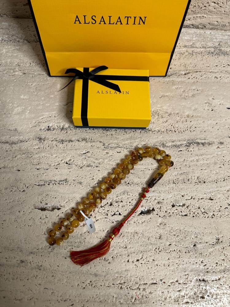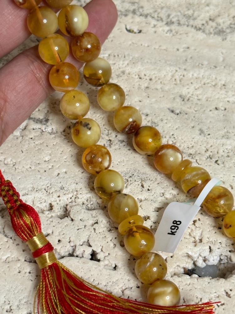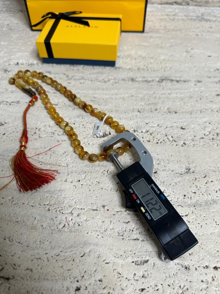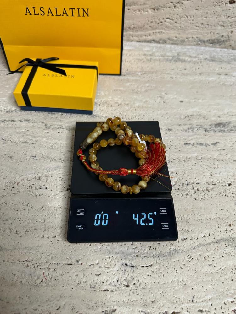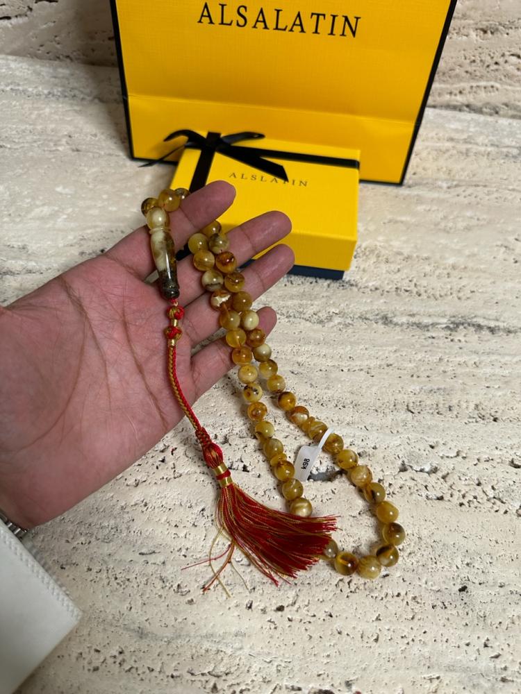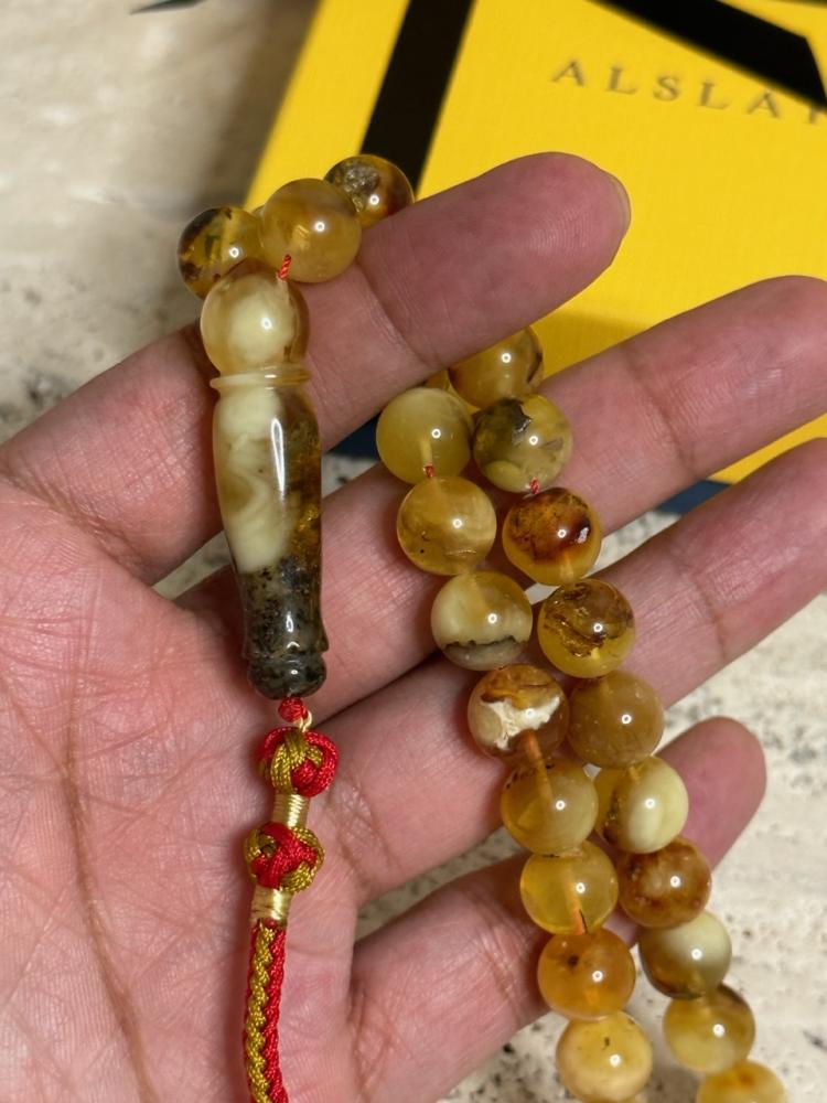 الكهرمان حجر عضوي ومن ميزته انه يكون خفيف الوزن واخف من اي سبحة ممكن تشوفه وصوت الخرز رنان يشبه صوت القزاز
