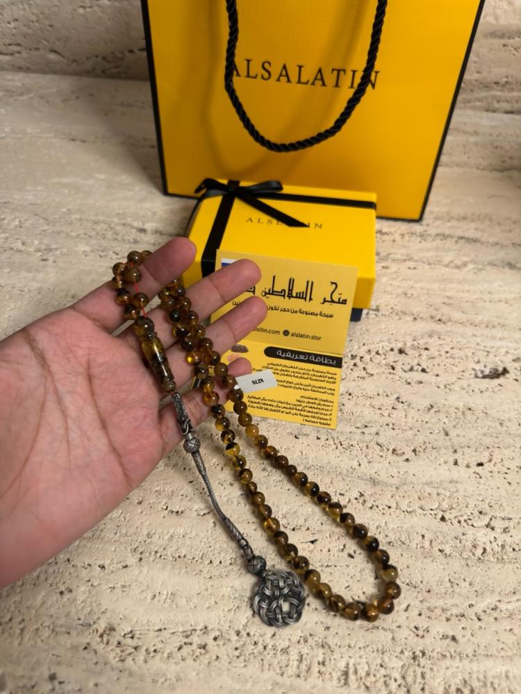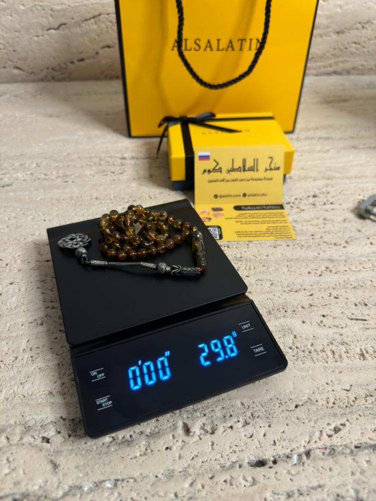 الكهرمان حجر عضوي ومن ميزته انه يكون خفيف الوزن واخف من اي سبحة ممكن تشوفه وصوت الخرز رنان يشبه صوت القزاز